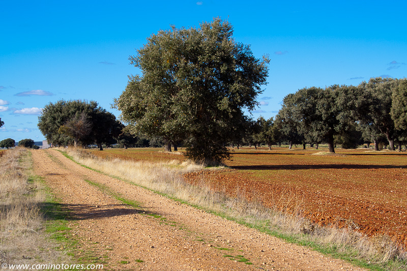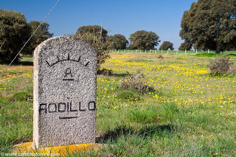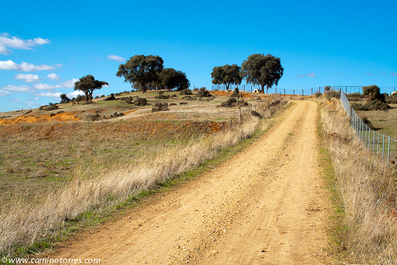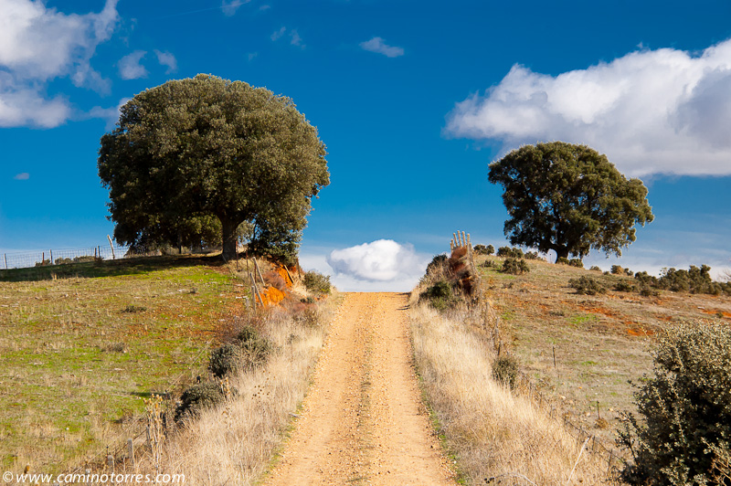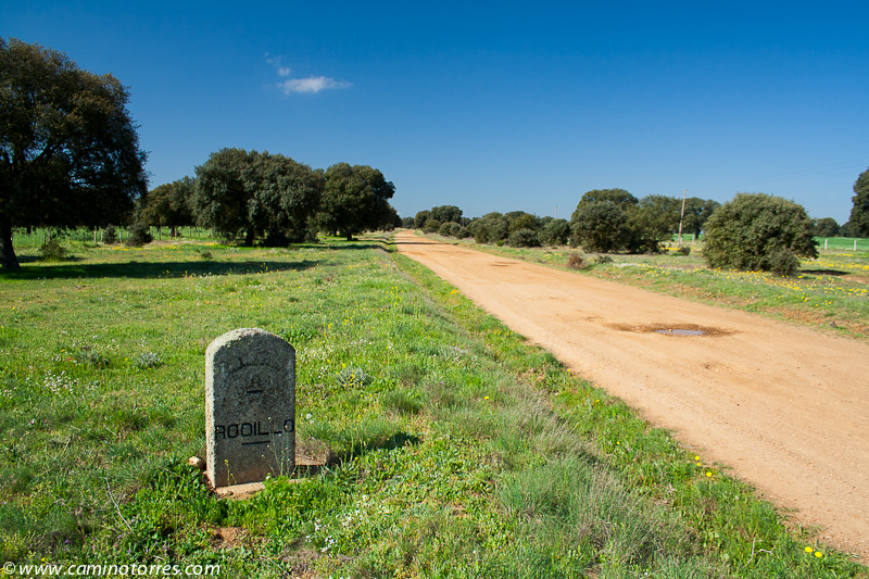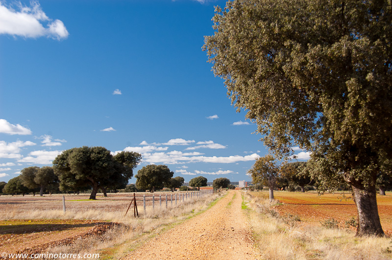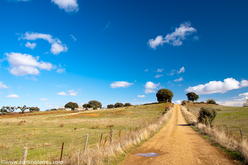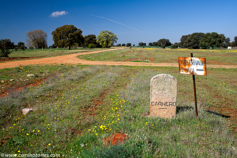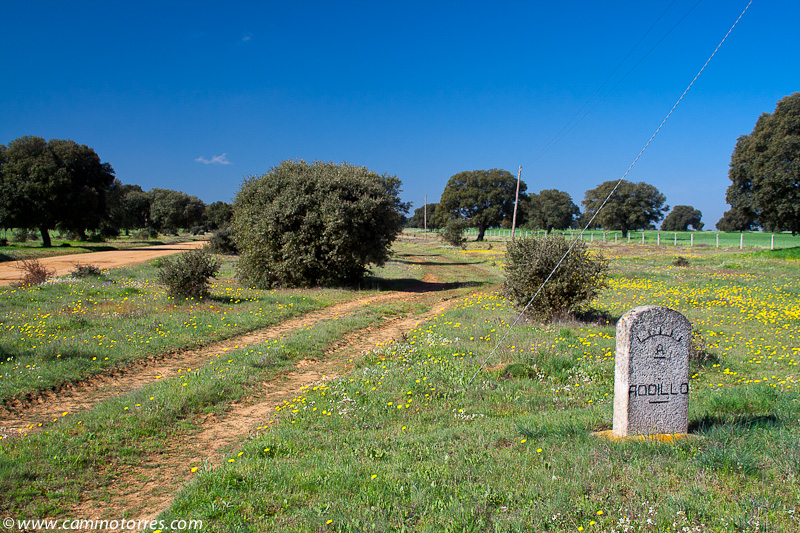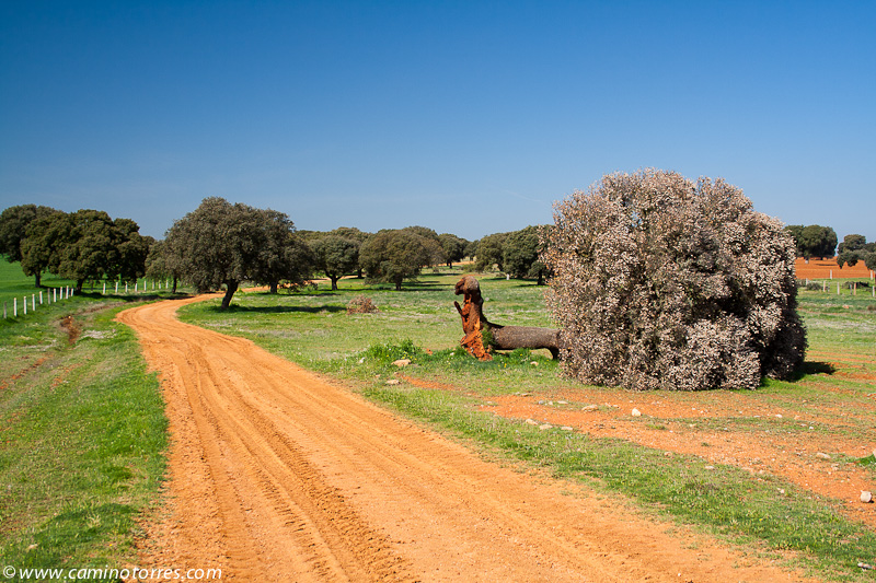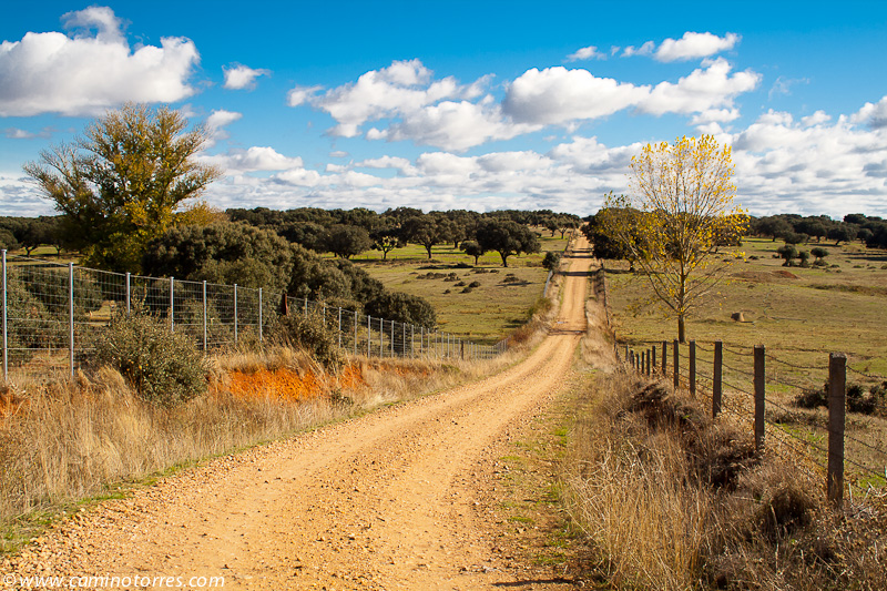 Llegamos a una carretera en mal estado que cruzamos para ya encontrarnos en todo su esplendor con la Cañada Real y las dehesas repletas de encinas que vamos a comenzar a atravesar y que nos acompañarán durante cuatro jornadas. A partir de aquí encontramos algunos paneles relacionados con la Cañada Real de Extremadura y estacas direccionales con la señalización IMBA de bicicleta de montaña. En los postes también encontraremos algunas placas con flechas amarillas que marcan el Camino Torres, ya que coinciden en este tramo. Desde este punto sólo vamos a encontrar tres pequeñas fincas de explotación agropecuaria: Rodillo, Carnero con su preciosa ermita de la Virgen de la Candelas (que ahora están en proceso de rehabilitación después de que se cayera todo su tejado) y El Tejado.