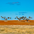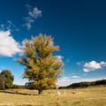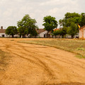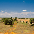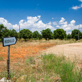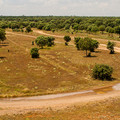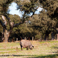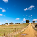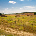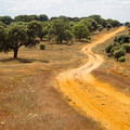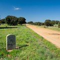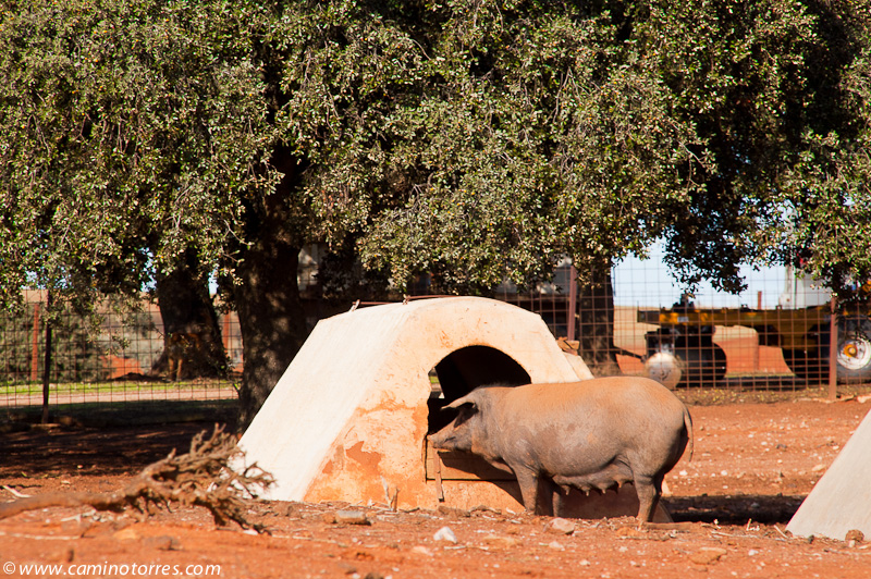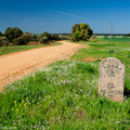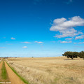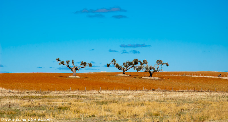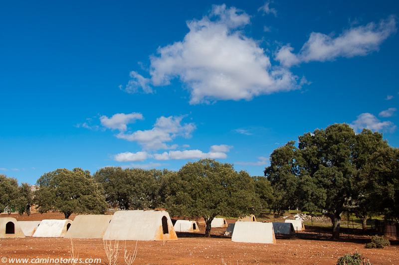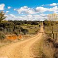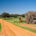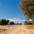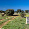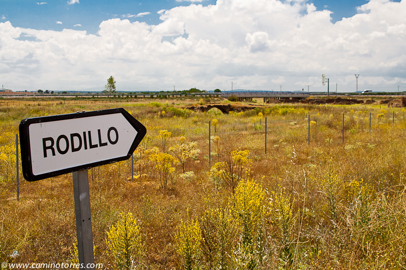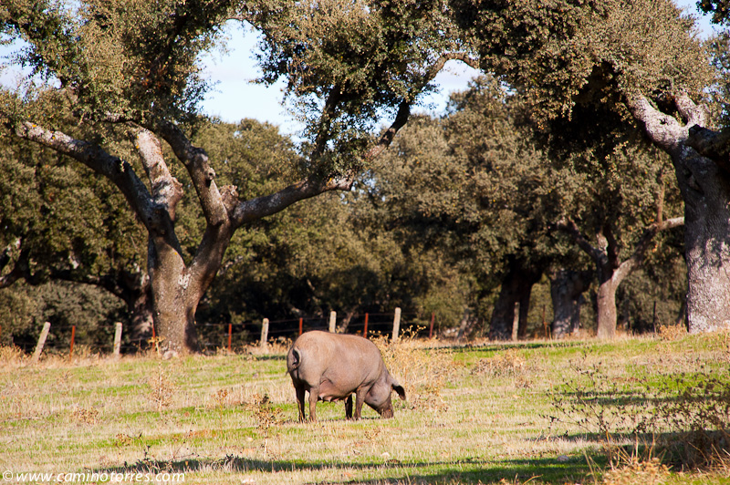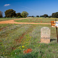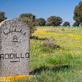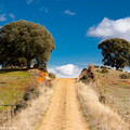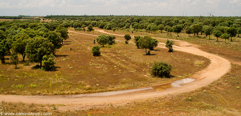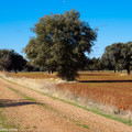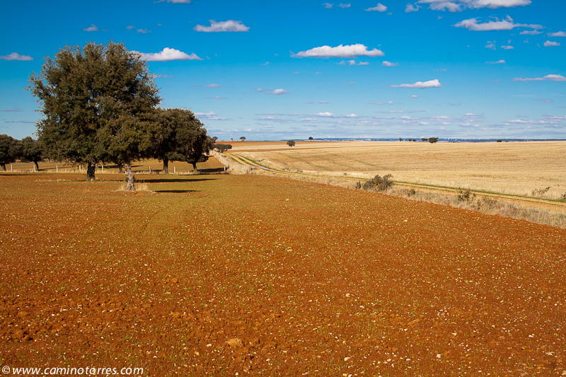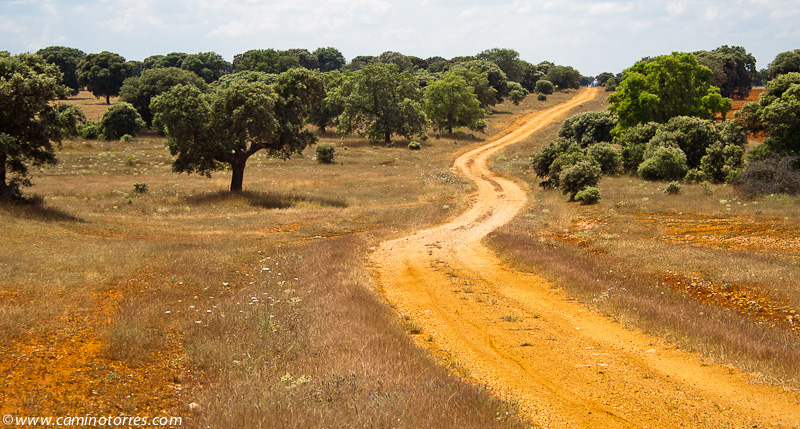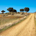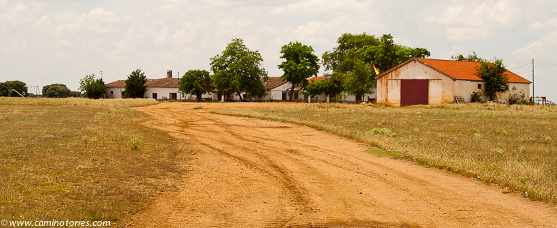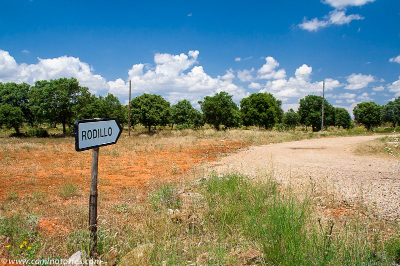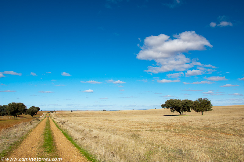 Llegamos a una carretera en mal estado que cruzamos para ya encontrarnos en todo su esplendor con la Cañada Real y las dehesas repletas de encinas que vamos a comenzar a atravesar y que nos acompañarán durante cuatro jornadas. A partir de aquí encontramos algunos paneles relacionados con la Cañada Real de Extremadura y estacas direccionales con la señalización IMBA de bicicleta de montaña. En los postes también encontraremos algunas placas con flechas amarillas que marcan el Camino Torres, ya que coinciden en este tramo. Desde este punto sólo vamos a encontrar tres pequeñas fincas de explotación agropecuaria: Rodillo, Carnero con su preciosa ermita de la Virgen de la Candelas (que ahora están en proceso de rehabilitación después de que se cayera todo su tejado) y El Tejado.