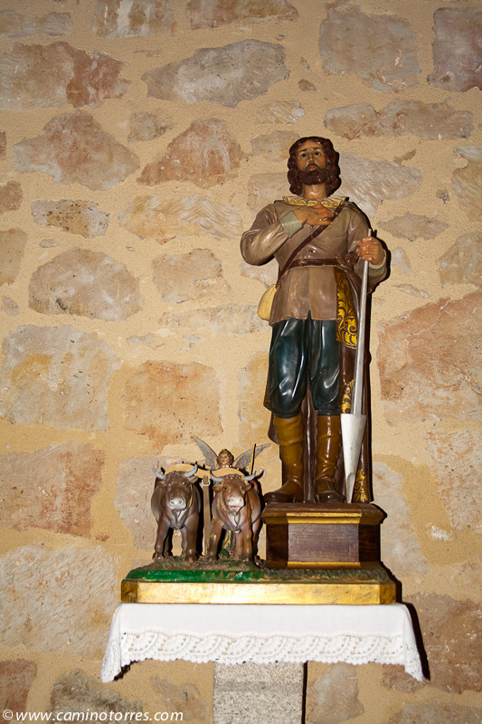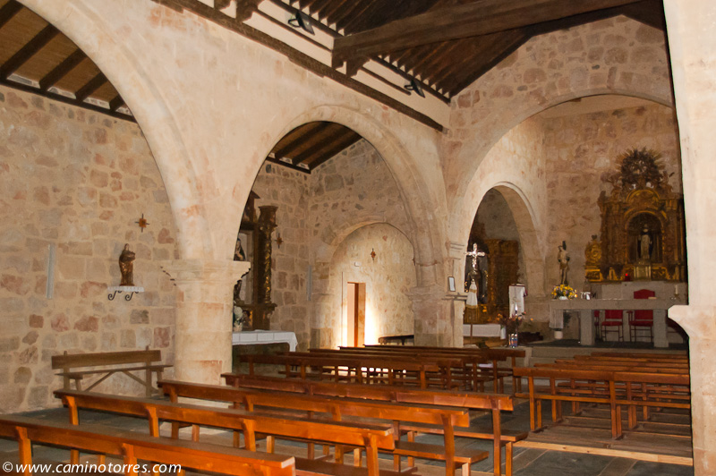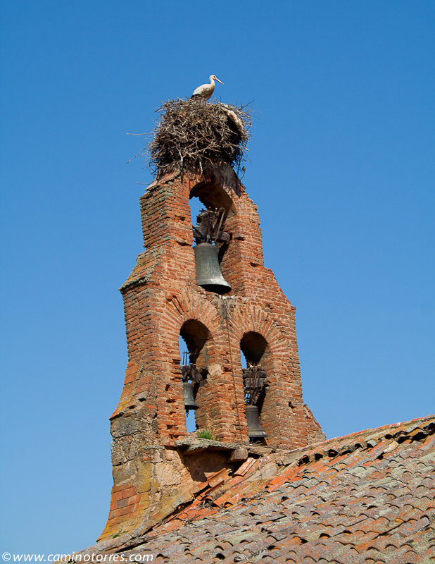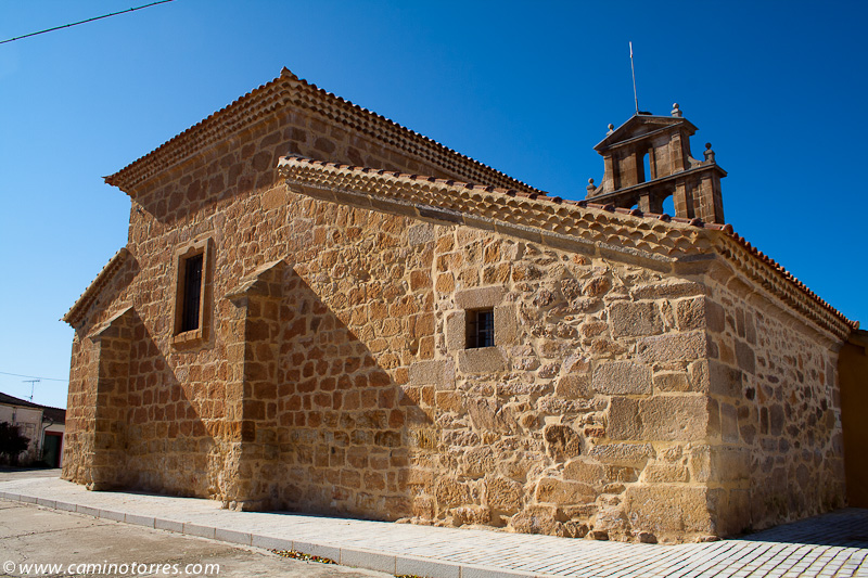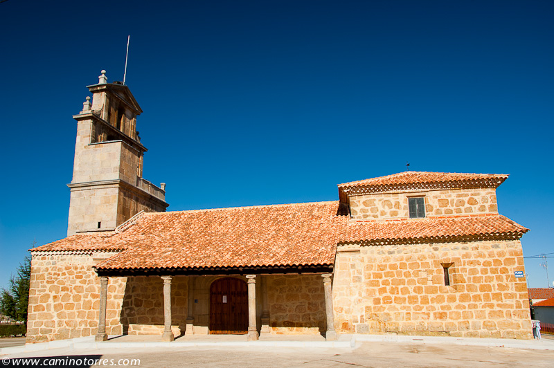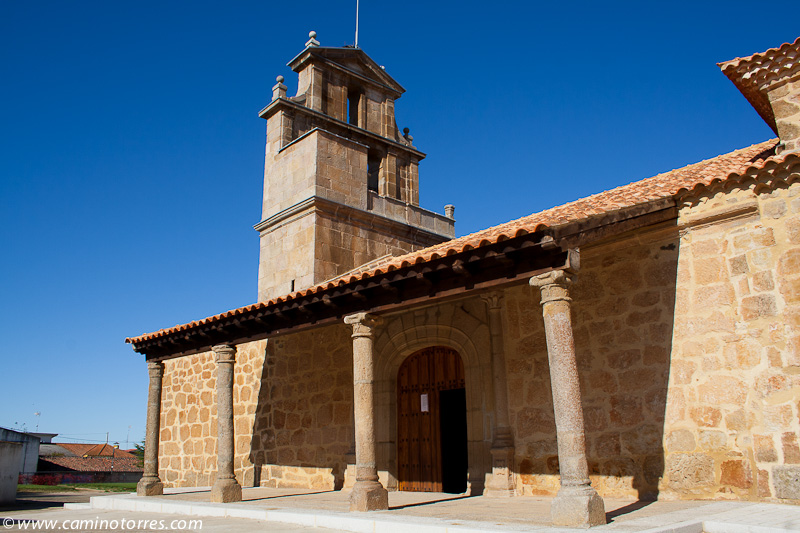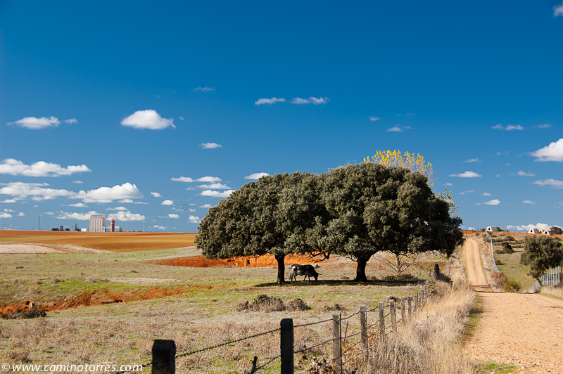 Durante tres kilómetros disponemos de la sombra de algunas encinas, pero después la cañada va entre campos de cultivo de secano durante dos kilómetros. Cuando llegamos de nuevo a un encinar y a un cruce de cuatro caminos, no seguimos la señal para bicicletas de las estacas que seguiría de frente por la Cañada Real, si no que giramos a la derecha y luego inmediatamente a la izquierda para caminar por una pista que nos deja en la carretera que nos conducirá después de un kilómetro hasta Robliza de Cojos. Nos recibe esta agradable población con su iglesia dedicada a Santo Domingo de Guzmán y su albergue de peregrinos.