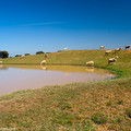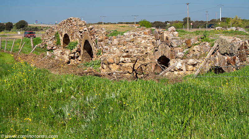 Las vías del tren y la carretera, dejan el hueco por el que discurre la cañada y por donde nosotros caminamos hasta confluir de nuevo a la N-620 a la altura de las casas de La Golpejera. Cruzamos la carretera, pero no seguimos por la carretera nacional y no pasamos por debajo de la autovía, sino que tomamos una pista que sale a la izquierda, y continúa en paralelo a la autovía por su izquierda. Si miramos a la derecha al cruzar un arroyo veremos a lo lejos el Puente de la Valmuza, muy deteriorado, de origen romano, y que se conserva milagrosamente como testigo del antiguo camino entre Salamanca y Ciudad Rodrigo.