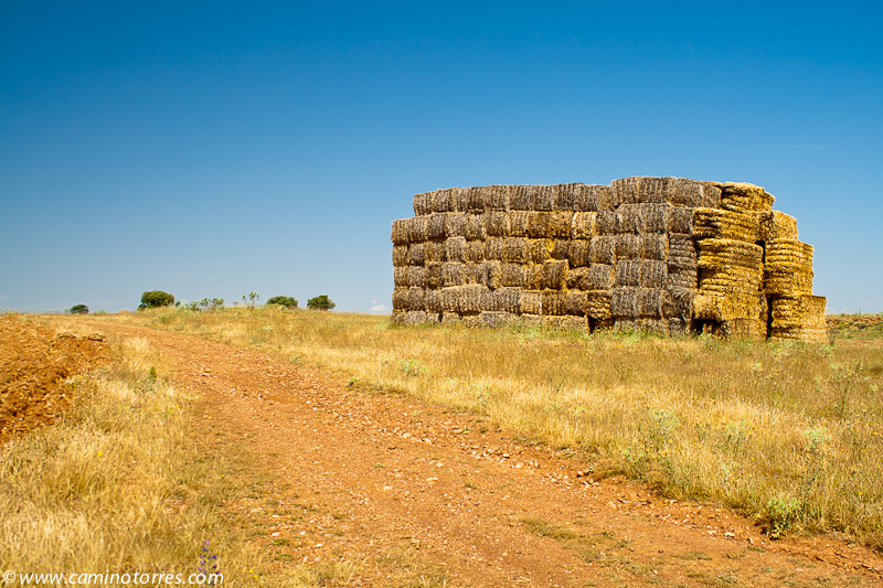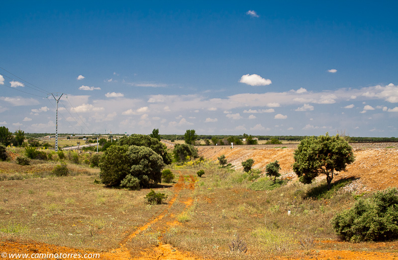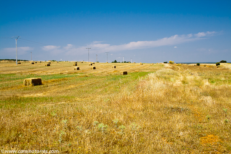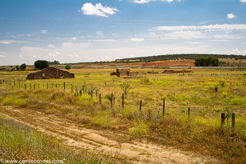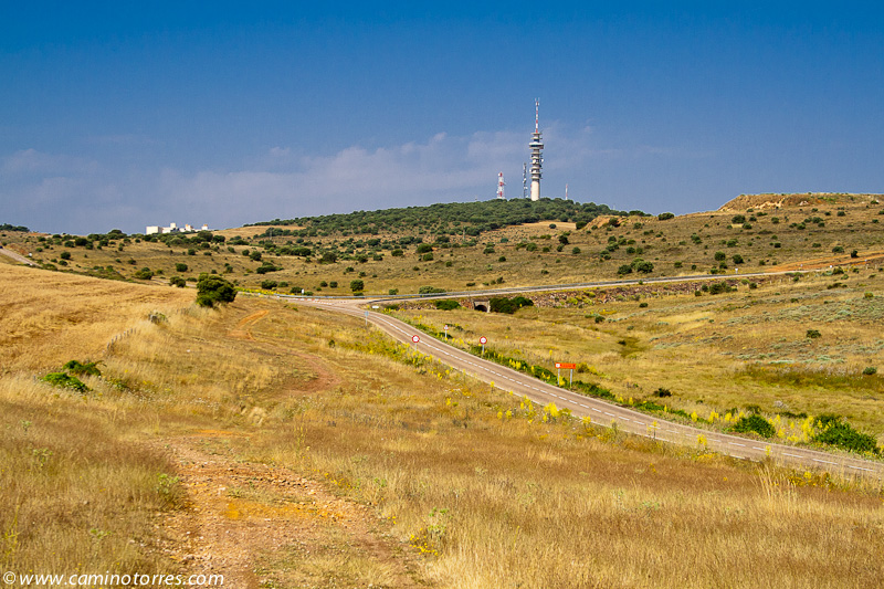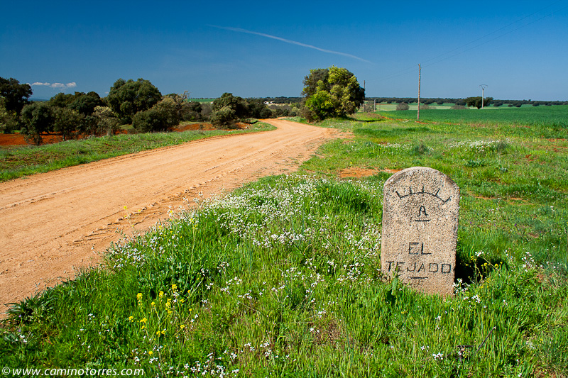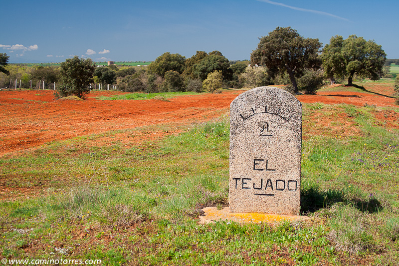 En un cruce importante nosotros seguimos de frente por la Cañada Real siguiendo la señalización de los postes balizados. Este cruce a la izquierda llevaría a El Tejado, con su ermita de San Silvestre y la torre del castillo del siglo XV que podemos contemplar a lo lejos. A la derecha sale el camino que después de cuatro kilómetros llevaría a Calzada de Don Diego, lugar en donde Torres Villarroel hizo parada en su primera escapada a Portugal. Esta población no cuenta con lugar para la pernocta del caminante.