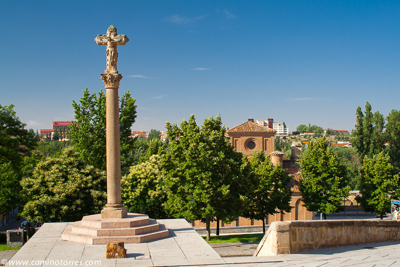 El kilómetro 0 del Camino Torres se encuentra en la Cueva de Salamanca, lugar donde en el año 1993 se puso la bellísima cabeza en bronce de Diego de Torres Villarroel, esculpida por Agustín Casillas. Desde este misterioso lugar, podemos despedirnos de don Diego y dirigirnos hacia el Patio Chico para contemplar la hermosa Torre del Gallo de la Catedral Románica. Seguimos por la calle Gibraltar y Tentenecio para finalmente llegar al Puente Romano sobre el río Tormes, dejando a nuestra izquierda la iglesia de Santiago. Con seguridad, en 1737, don Diego también utilizó este puente para dejar atrás su ciudad y dirigirse hacia Santiago de Compostela. Cruzamos por los semáforos y seguimos de frente por la Carretera de la Fregeneda, hasta que encontramos la gasolinear de Repsol que rodeamos por detrás para coger una pista que nos lleva a cruzar el Arroyo de Zurguén, por un puente que sale a la derecha. Nada más cruzarlo giramos a la izquierda, entre una zona con bancos, para ir hacia el paso inferior peatonal de la vía del tren.