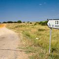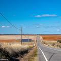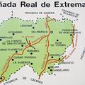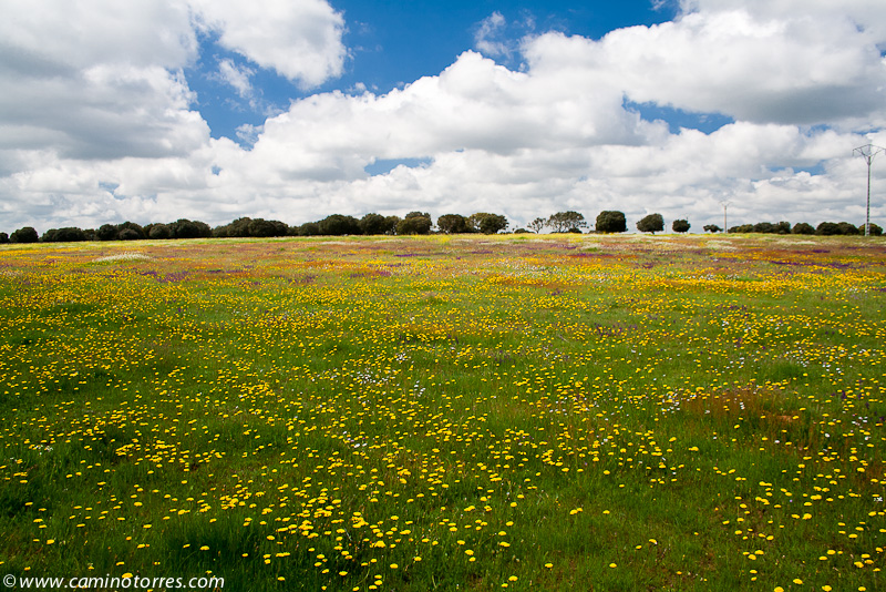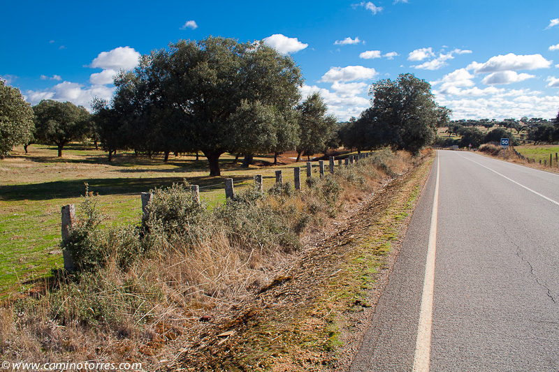Caminamos casi 3 kilómetros por el arcén de la carretera nacional con muchísima precaución, hasta que llegamos al cruce a la izquierda que indica hacia Villalba de los Llanos. Esta carretera apenas tiene tráfico, de forma que con precaución pero con más tranquilidad, caminamos 2 kilómetros hasta llegar al cruce con la Cañada Real de Extremadura que viene desde Cojos de Robliza, donde encontramos de nuevo las estacas con flechas amarillas y con la señalización IMBA para bicicletas. El cruce también está marcado con placas azules con flechas amarillas.