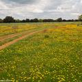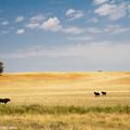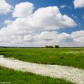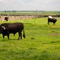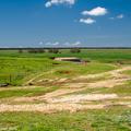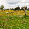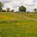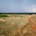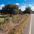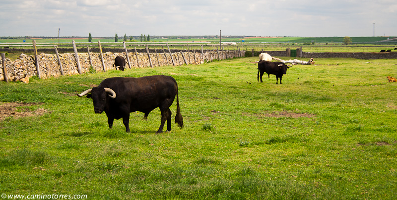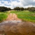 Tras vadear el arroyo, la cañada se ensancha, dejando a un lado y otro fincas ganaderas donde no será raro avistar algún toro bravo. El camino nos conduce hasta una carretera que, hacia la izquierda, llevaría a Villalba de los Llanos. Debemos cruzarla con atención y estar pendientes del punto donde reaparecen las flechas amarillas sobre fondo azul y la señalización IMBA para bicicletas. Poco después, el sendero se vuelve más definido, con marcadas roderas de vehículos todoterreno.