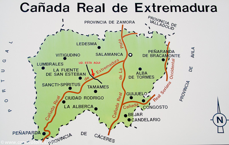Mucha atención: pueden verse algunas flechas amarillas marcadas en sentido contrario hacia Salamanca, así como algunos mojones y señalización vertical metálica que indican el sentido contrario.