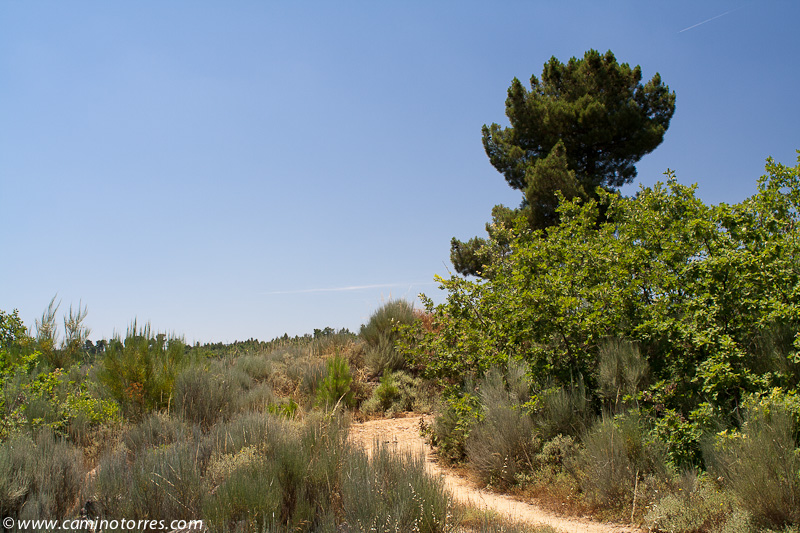 Después de unos dos kilómetros por asfalto, tomamos a la izquierda una pista que en suave descenso nos lleva a Póvoa d’El-Rei. Desde esta población descendemos hasta el valle de la ribeira de Massueime, donde en un bello rincón solitario nos sorprende un magnífico puente que atravesamos, para continuar durante aproximadamente un kilómetro disfrutando de la sombra que proporciona su agradable bosque de ribera.