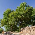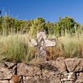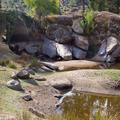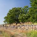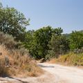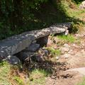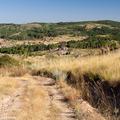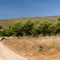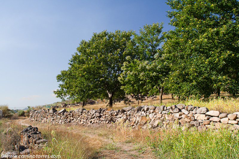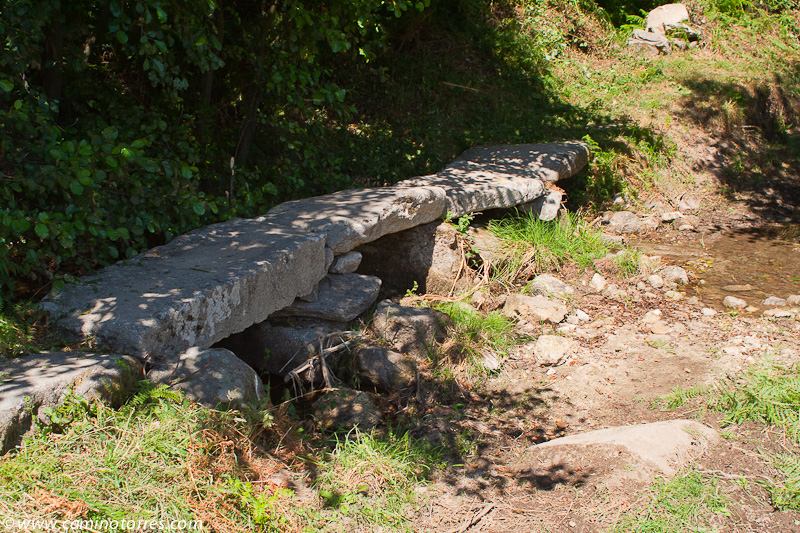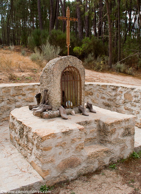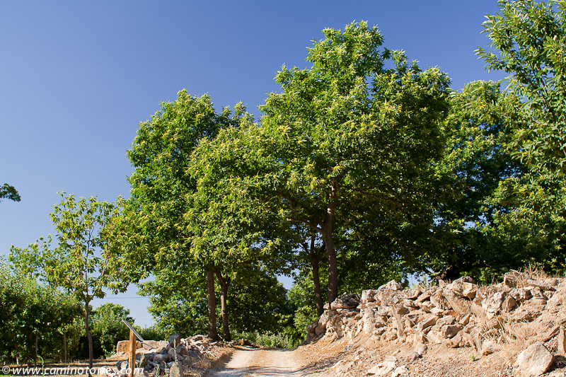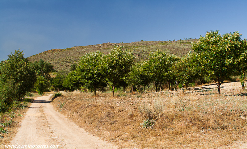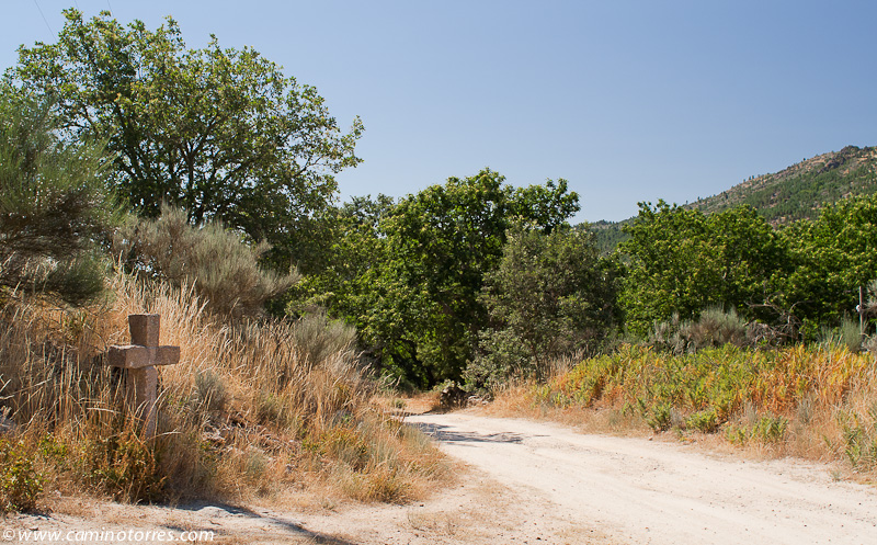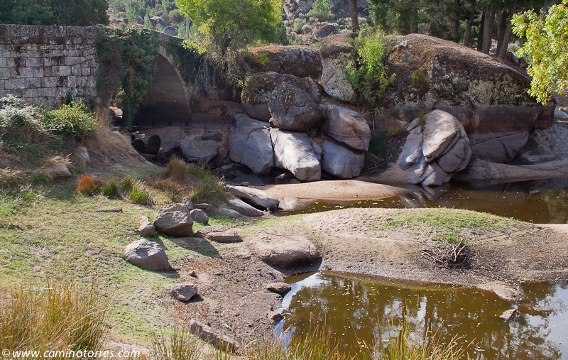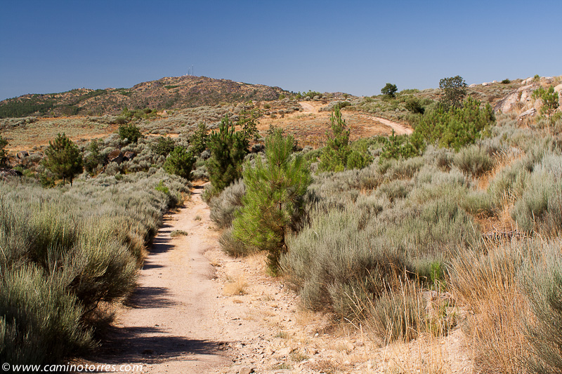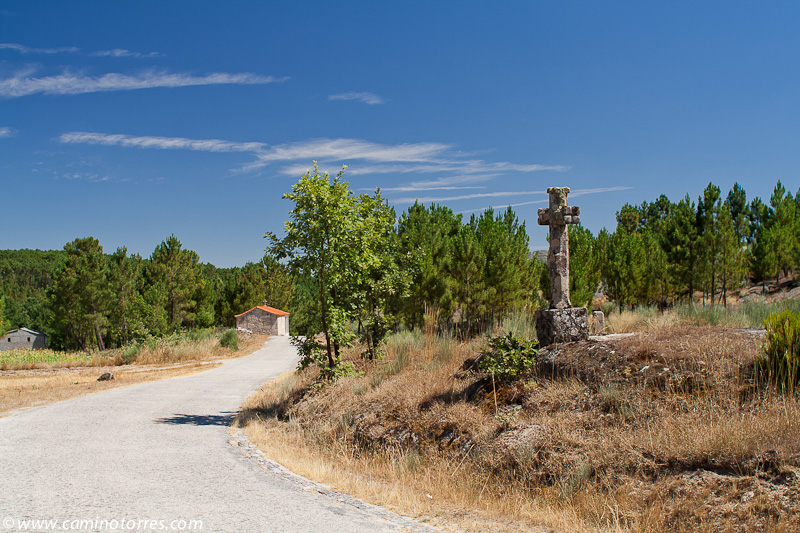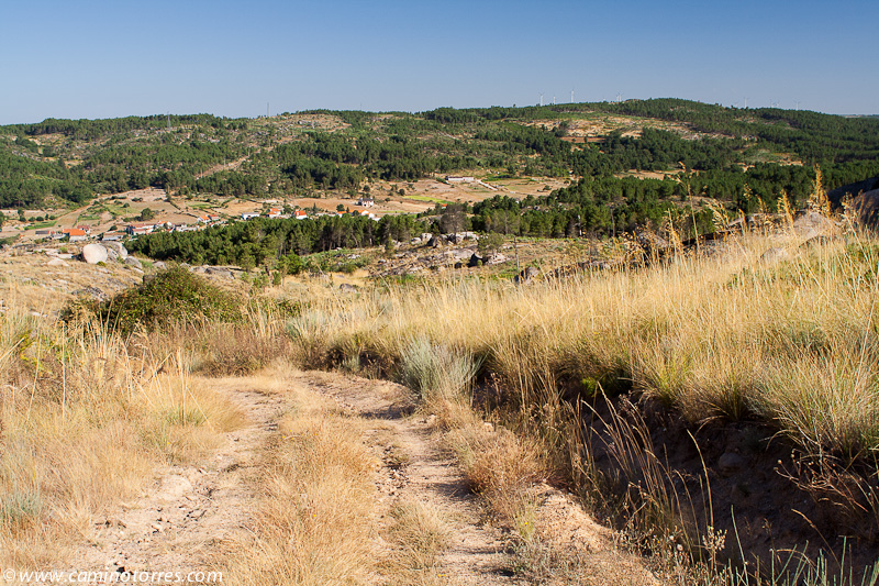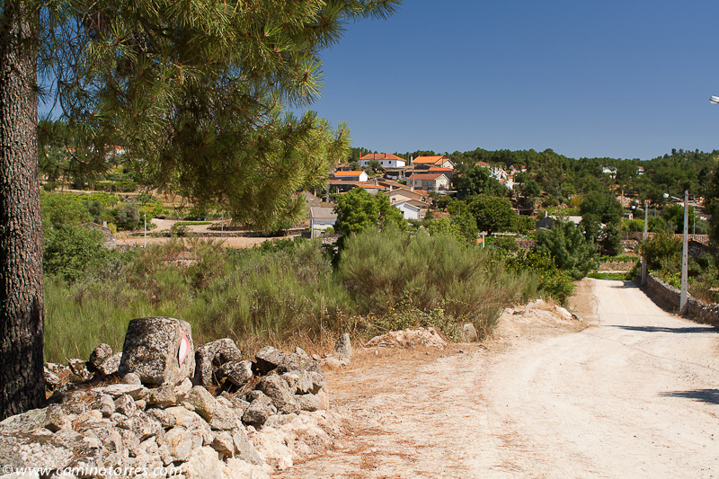 Después de cruzar el riachuelo y pararnos a ver el empedrado de los restos de unas posible vía romana, remontamos un desnivel pronunciado atravesando entre pinos la Mata da Caldeira. Cuando llegamos arriba nos cruzamos con una pista ancha en que vemos marcas del GR 22, que ya habíamos encontrado en Almeida. Cruzamos la carretera y nos vamos acercando a las orillas del río Távora.