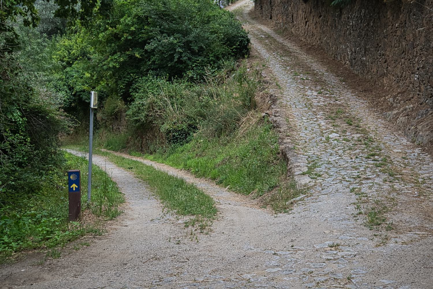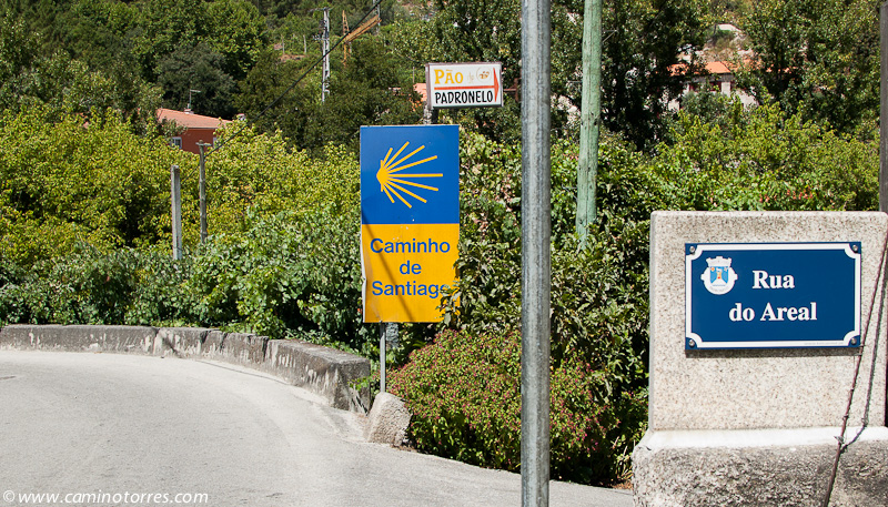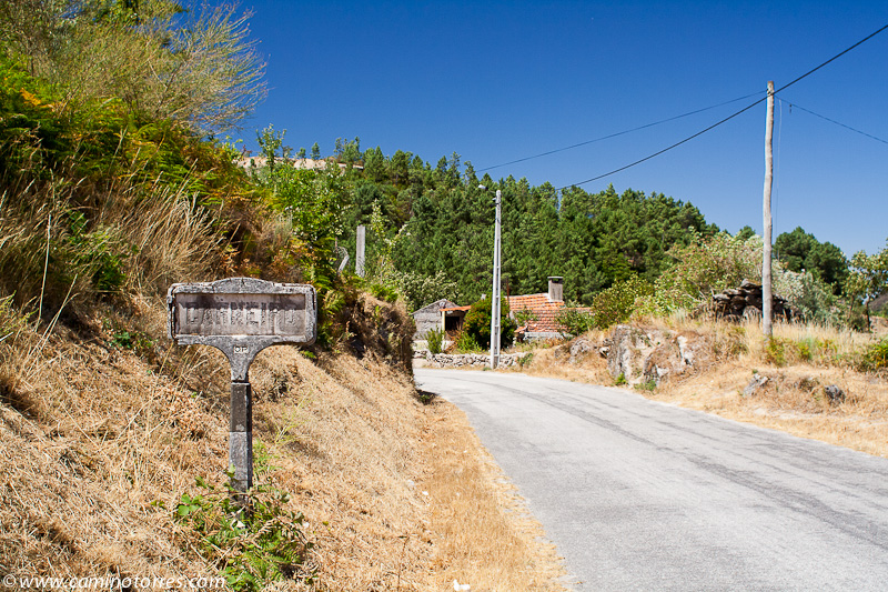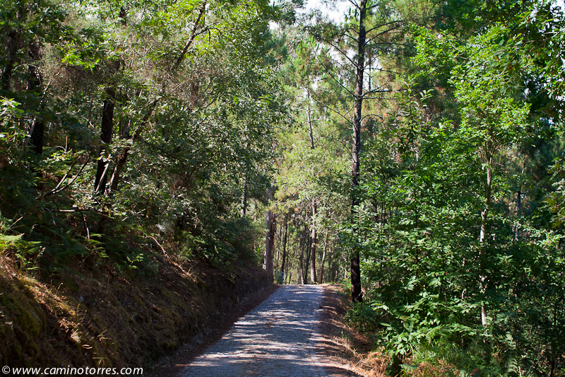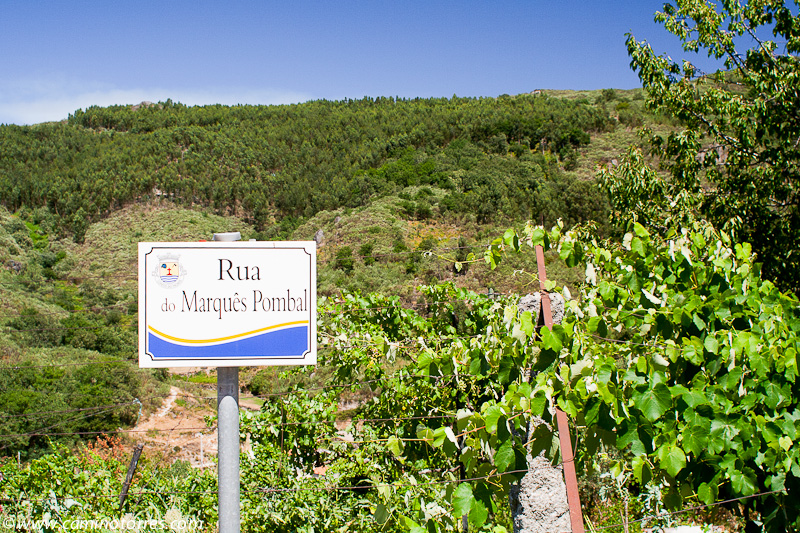 Por esta carretera, con mucha precaución confluimos a la N101 en un punto donde encontramos una fuente y una parada de autobús, y donde tomamos la carretera secundaria indicada hacia Carneiro. Esta carretera, ahora asfaltada, y que va paralela a la N101, es la interminable Rua Marquês de Pombal, también denominada Estrada Pombalina. Transitaremos por ella nueve largos kilómetros, atravesando con tranquilidad gran número de pequeñas poblaciones como Outeiro, Reboreda, Bailadouro, Corujeiras y Vinhateiro, en alguna de las cuales podemos encontrar algún local abierto para recuperar fuerzas. A pesar del asfalto, el camino en leve descenso, es un agradable paseo que va a la orilla de los ríos Carneiro y Fornelo. La Estrada Pombalina desemboca finalmente en la carretera N101. Continuamos, con muchísima precaución, por el arcén durante 400 metros, hasta que encontramos una señal vertical que nos sacaría a la derecha de la carretera nacional. En este momento debemos tomar una importante decisión.