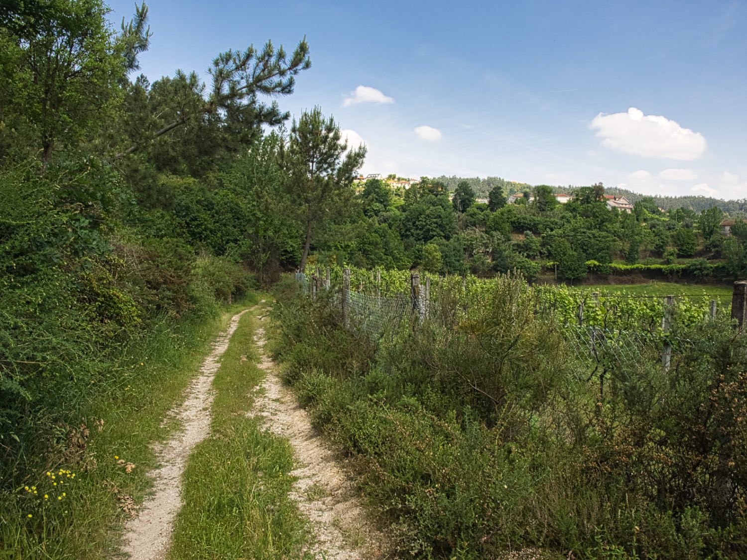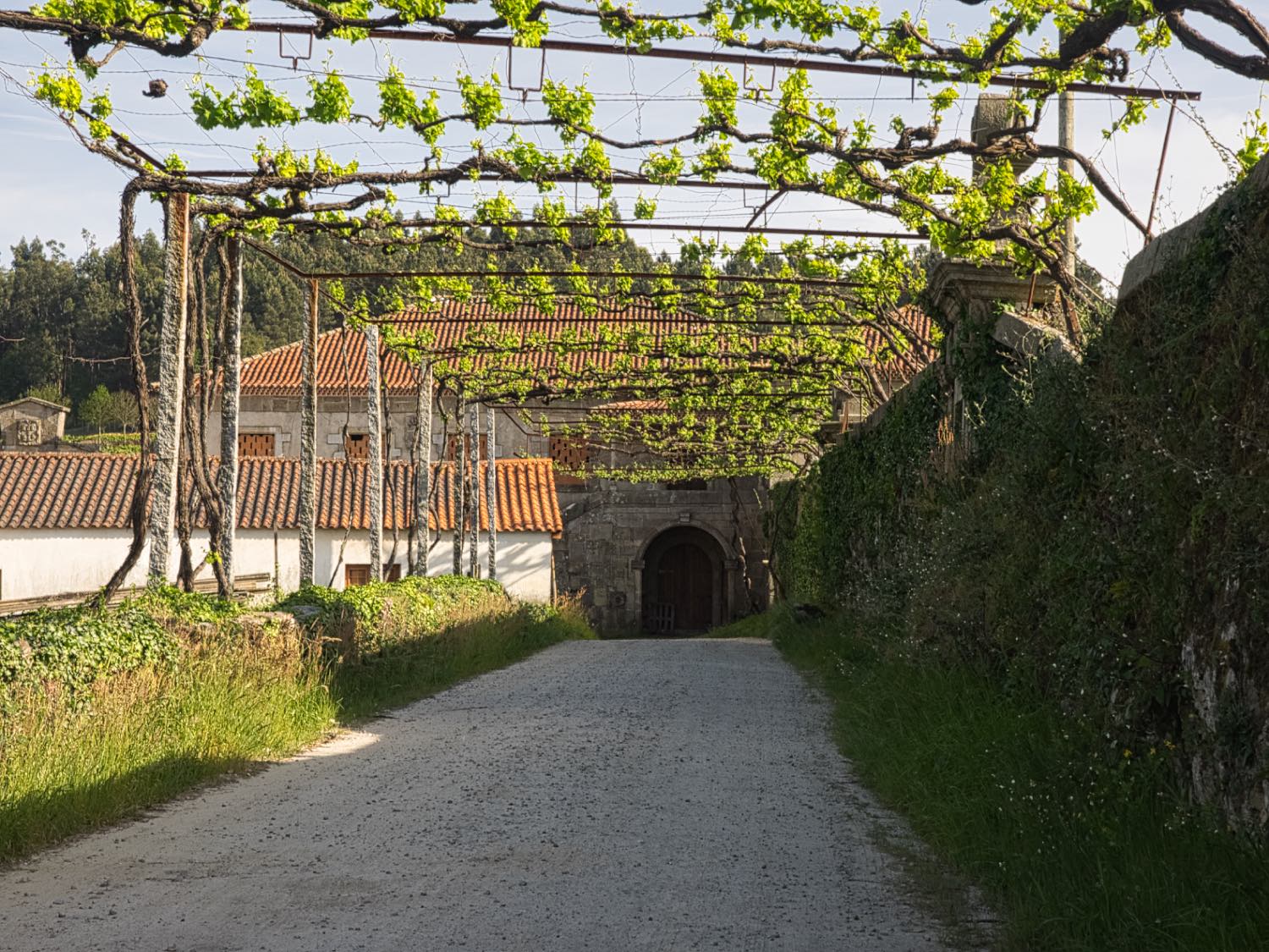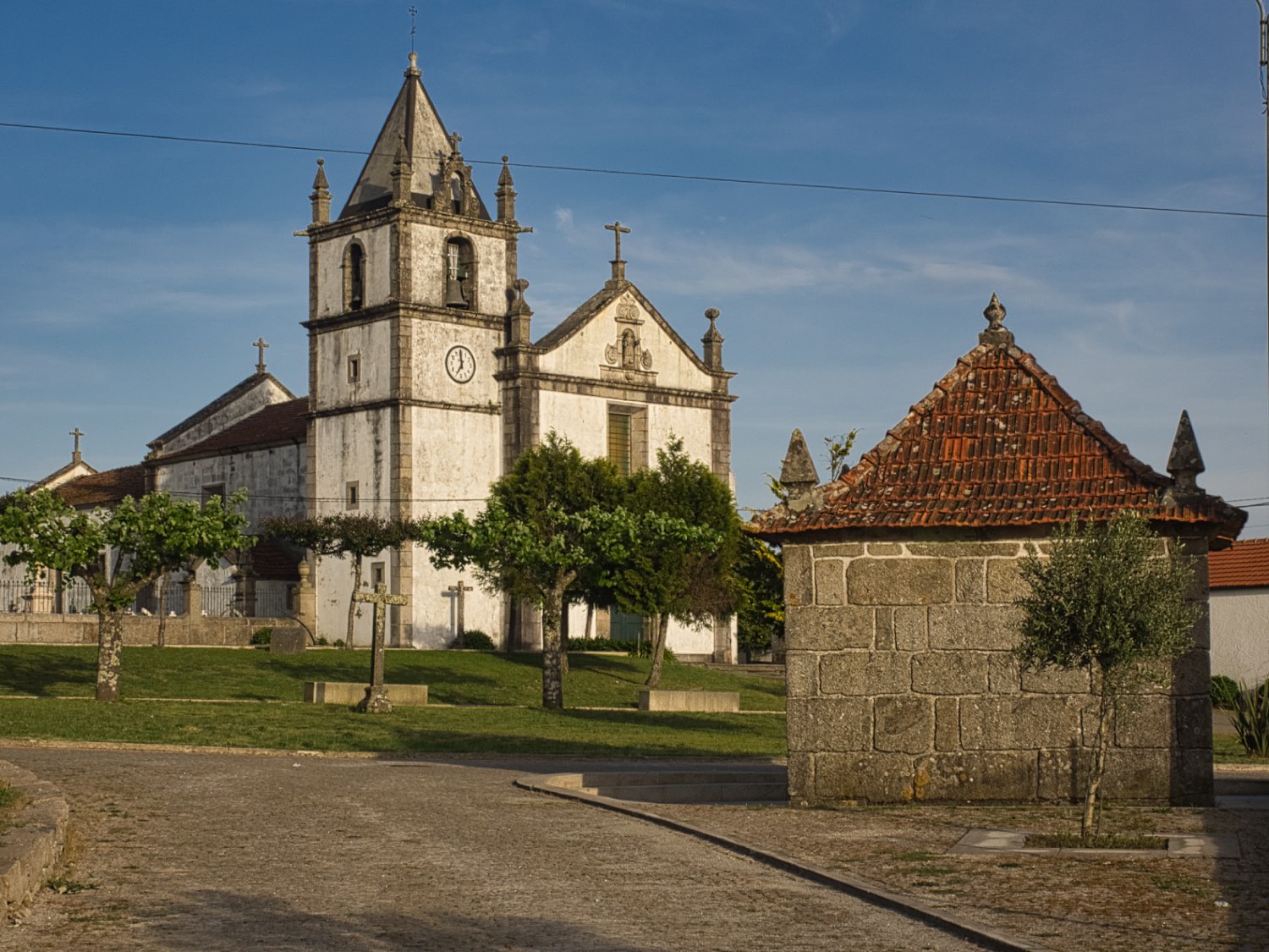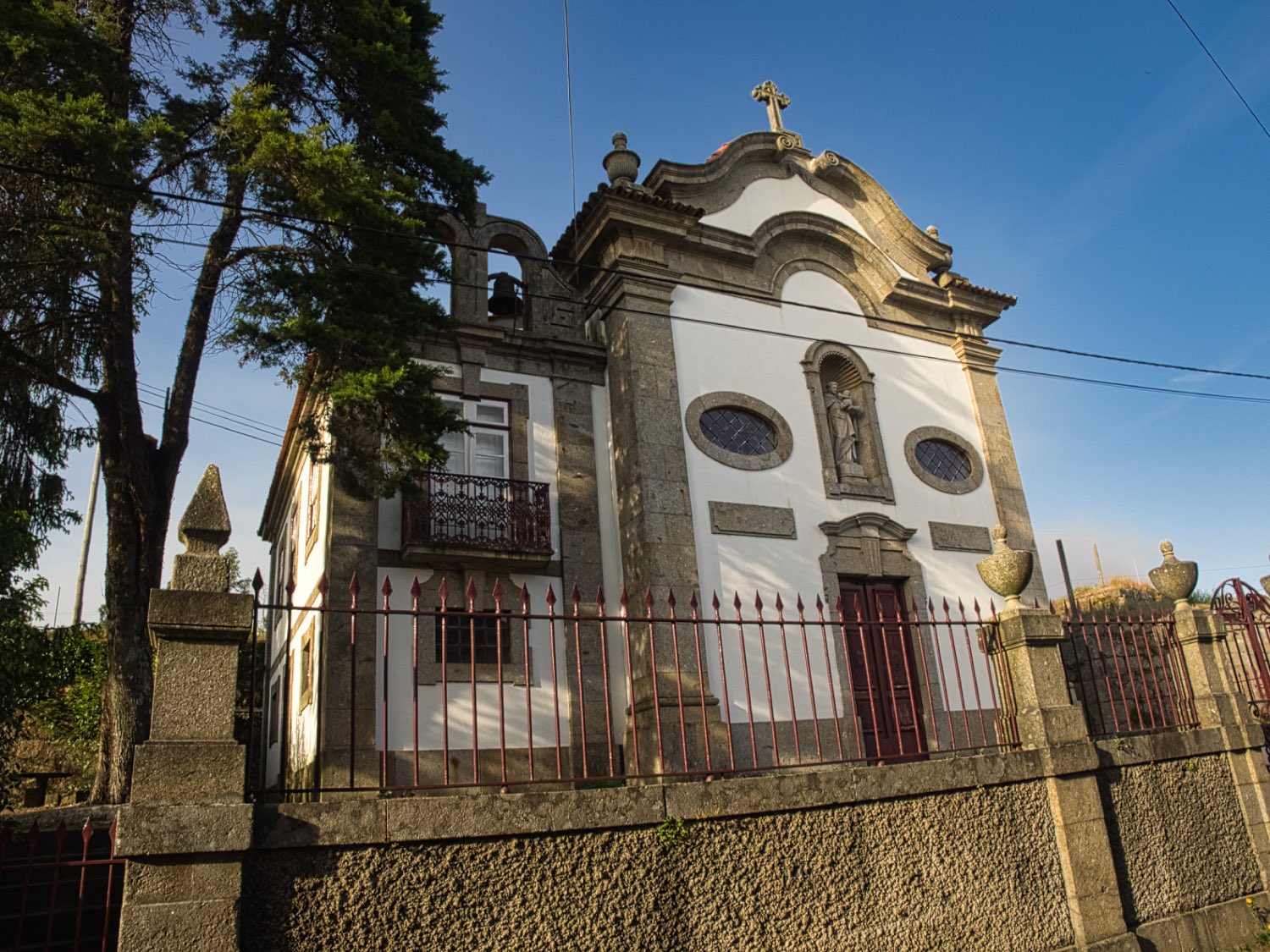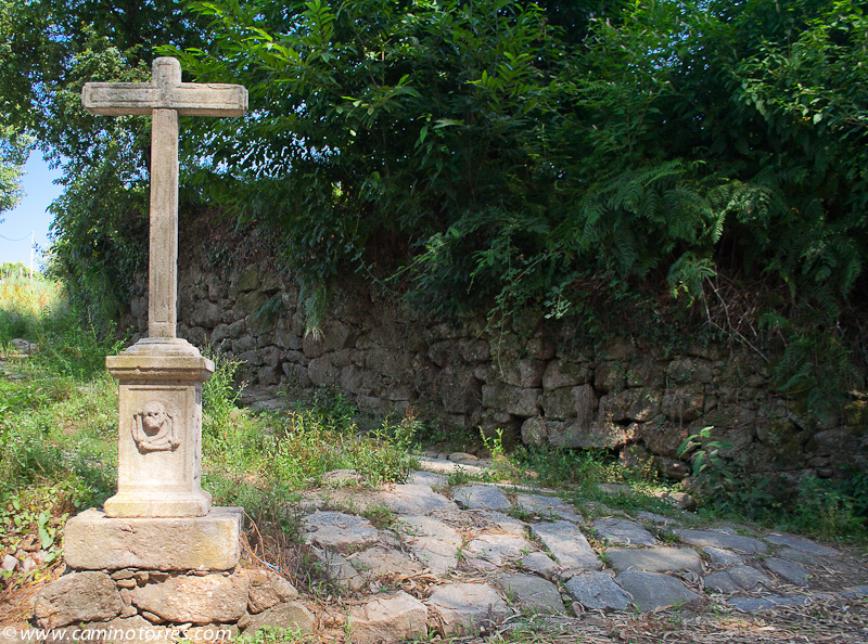 Nos espera un tramo urbano muy largo de más de dos kilómetros, hasta que la Travesa do Santo, que está empedrada nos va sacando poco a poco de nuevo al medio rural. Después de varios desvíos llegamos a un carretera asfaltada que se cruza con la Calçada da Piedade, justo en el punto en que encontramos un cruceiro. La calzada empedrada es medieval a pesar de que un cartel nos indica su origen romano. Subiremos por la calzada y enseguida llegamos al monasterio medieval de São Martinho de Caramos. El conjunto que forma la iglesia, junto al calvario y varias capillas y templetes constituyen un buen punto para reposar y coger fuerzas para afrontar los últimos kilómetros de la etapa que, de nuevo, serán por un entorno muy urbanizado.