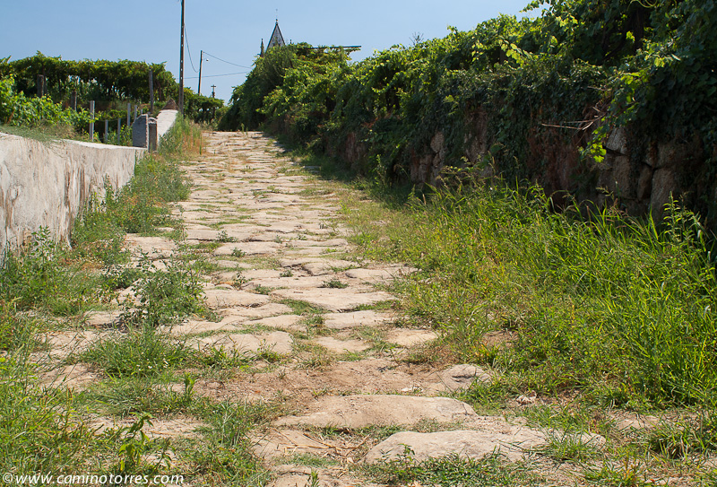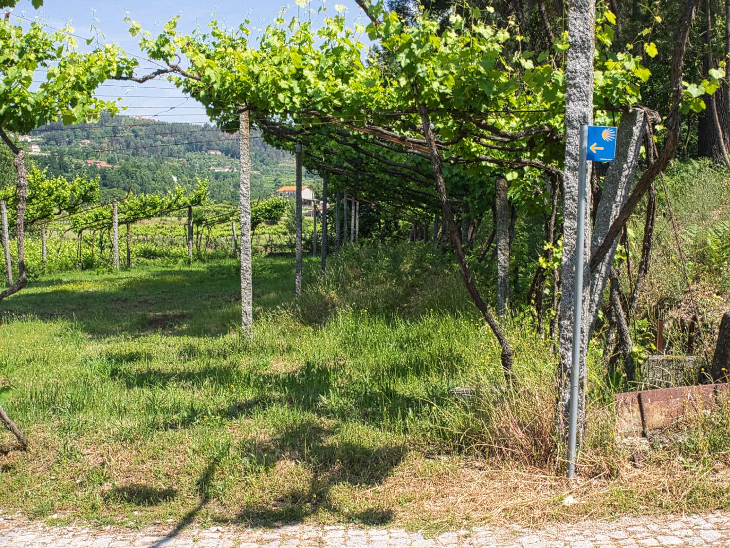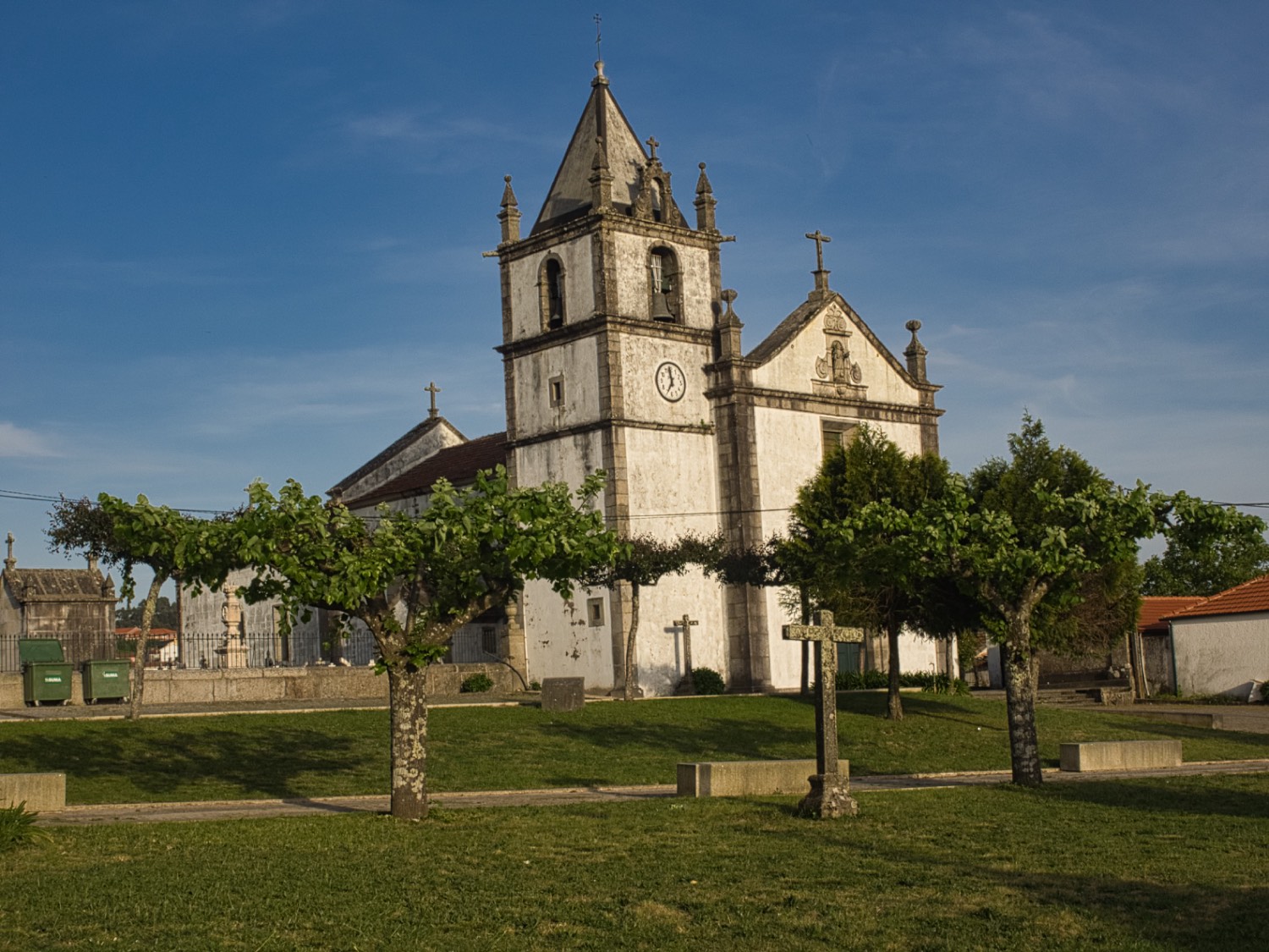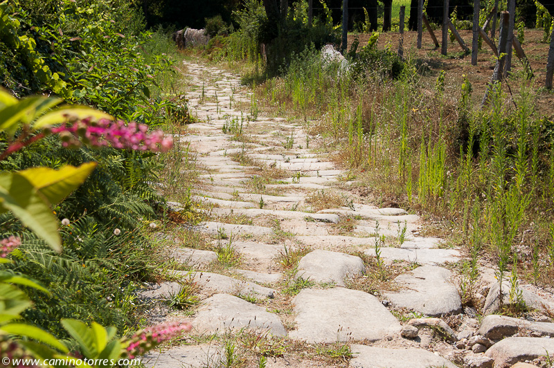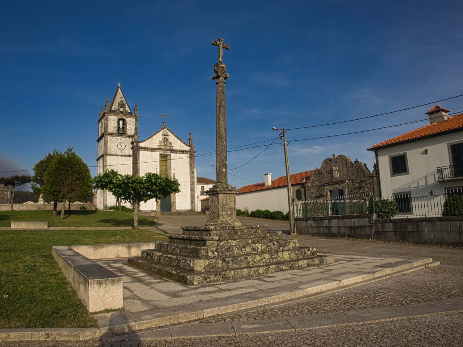 Nos espera un tramo urbano muy largo de más de dos kilómetros, hasta que la Travesa do Santo, que está empedrada nos va sacando poco a poco de nuevo al medio rural. Después de varios desvíos llegamos a un carretera asfaltada que se cruza con la Calçada da Piedade, justo en el punto en que encontramos un cruceiro. La calzada empedrada es medieval a pesar de que un cartel nos indica su origen romano. Subiremos por la calzada y enseguida llegamos al monasterio medieval de São Martinho de Caramos. El conjunto que forma la iglesia, junto al calvario y varias capillas y templetes constituyen un buen punto para reposar y coger fuerzas para afrontar los últimos kilómetros de la etapa que, de nuevo, serán por un entorno muy urbanizado.