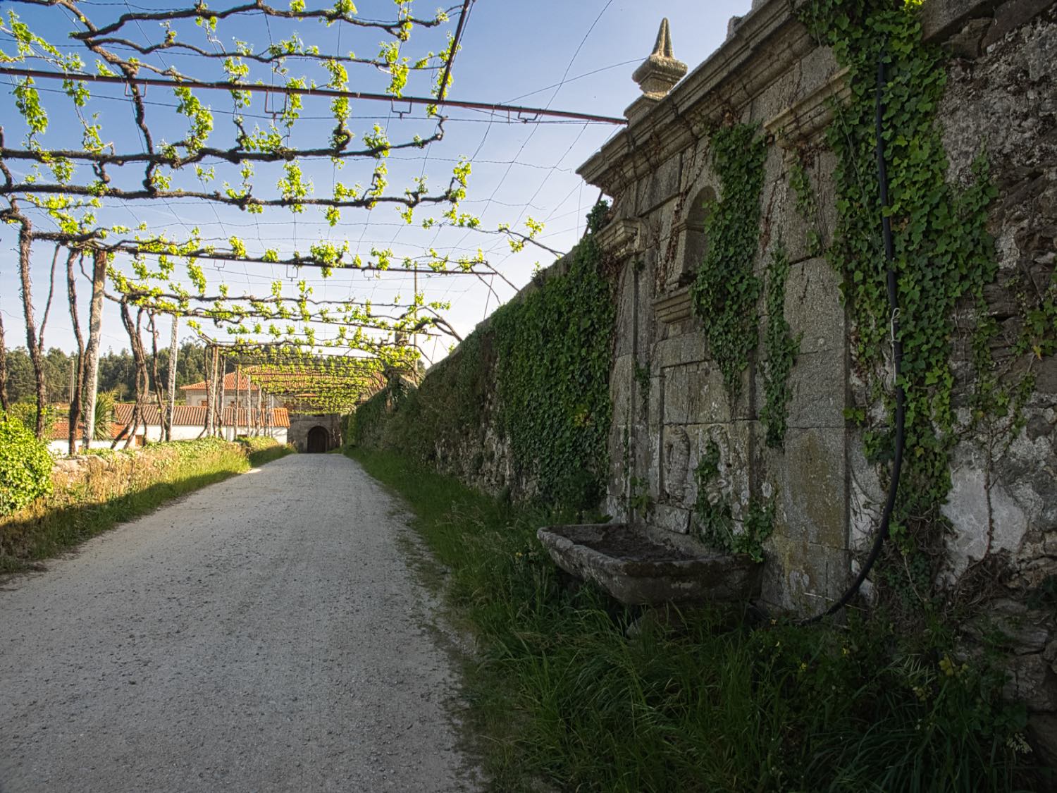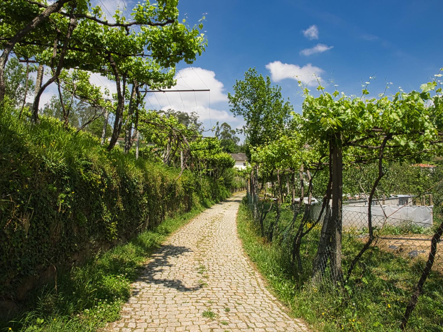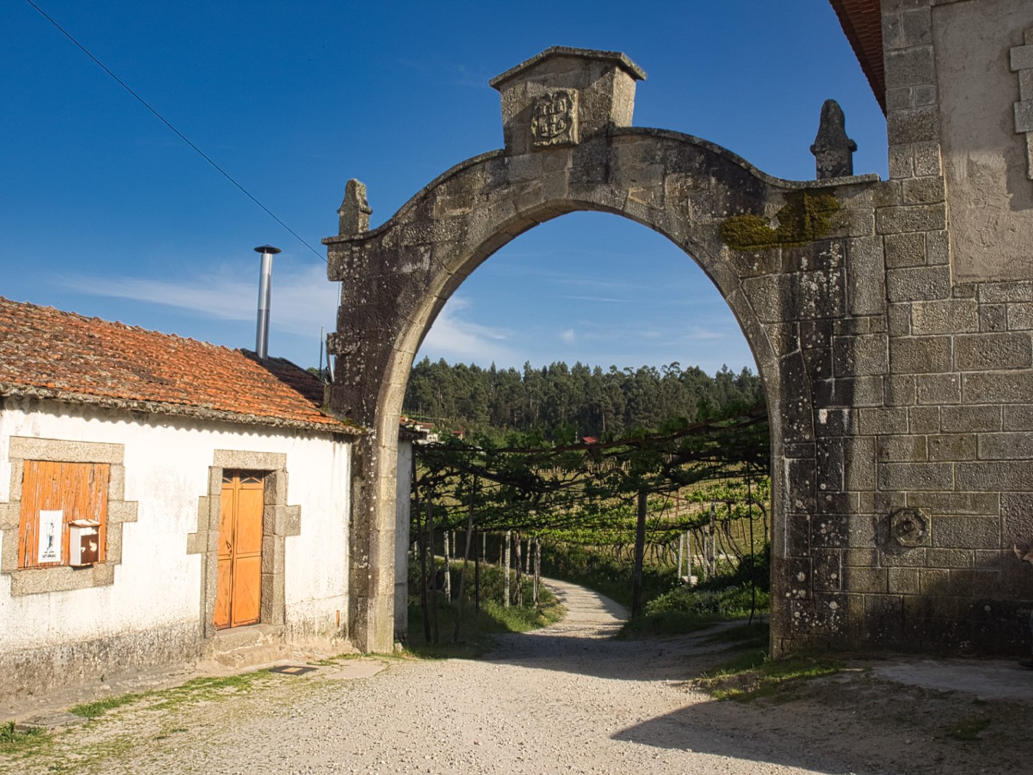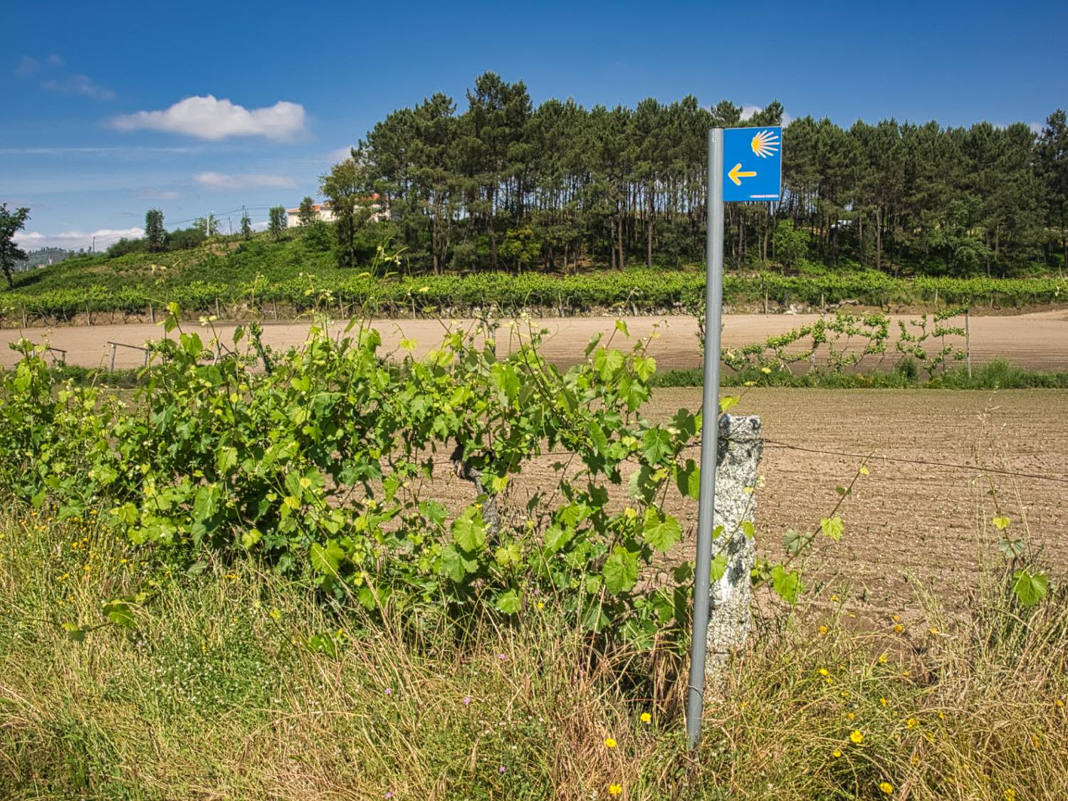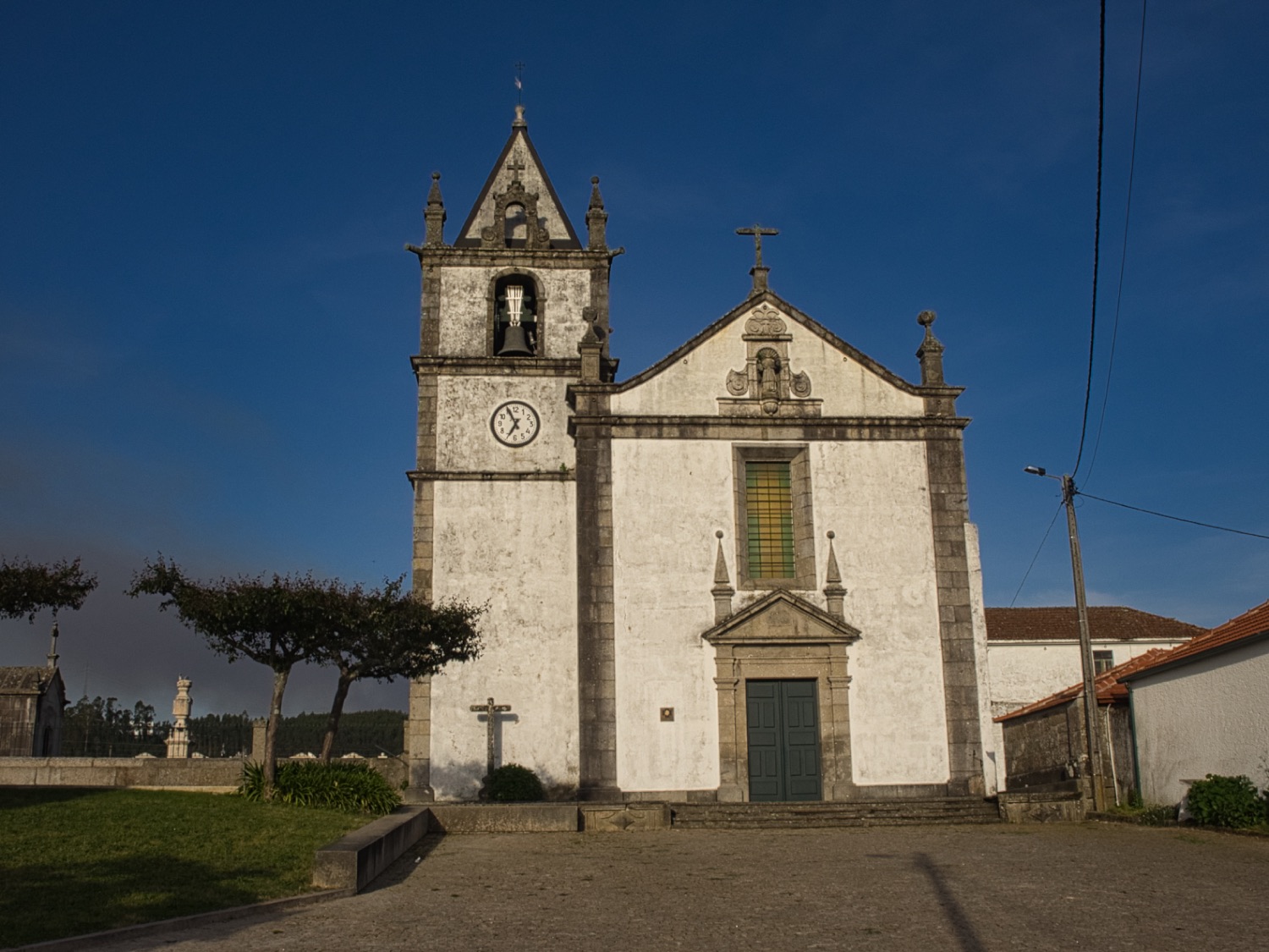 Nos espera un tramo urbano muy largo de más de dos kilómetros, hasta que la Travesa do Santo, que está empedrada nos va sacando poco a poco de nuevo al medio rural. Después de varios desvíos llegamos a un carretera asfaltada que se cruza con la Calçada da Piedade, justo en el punto en que encontramos un cruceiro. La calzada empedrada es medieval a pesar de que un cartel nos indica su origen romano. Subiremos por la calzada y enseguida llegamos al monasterio medieval de São Martinho de Caramos. El conjunto que forma la iglesia, junto al calvario y varias capillas y templetes constituyen un buen punto para reposar y coger fuerzas para afrontar los últimos kilómetros de la etapa que, de nuevo, serán por un entorno muy urbanizado.
