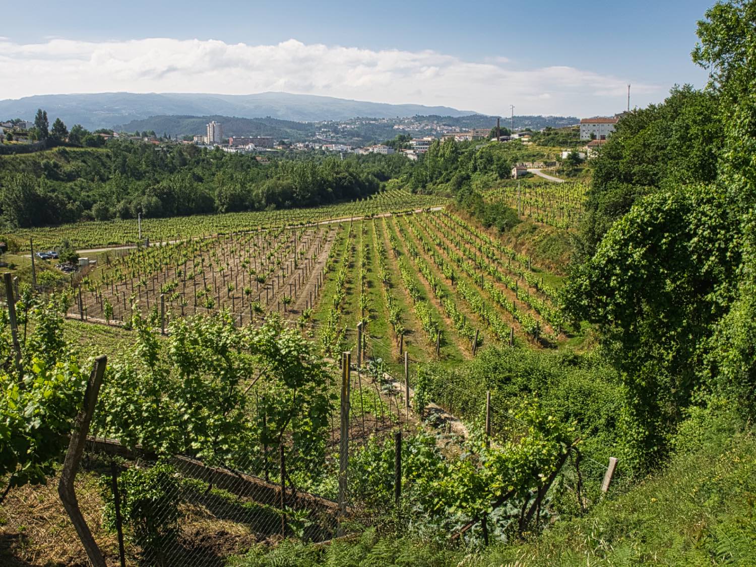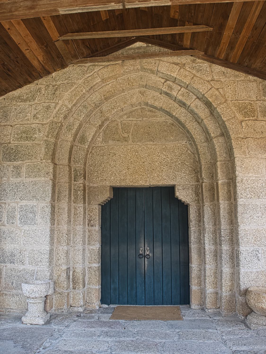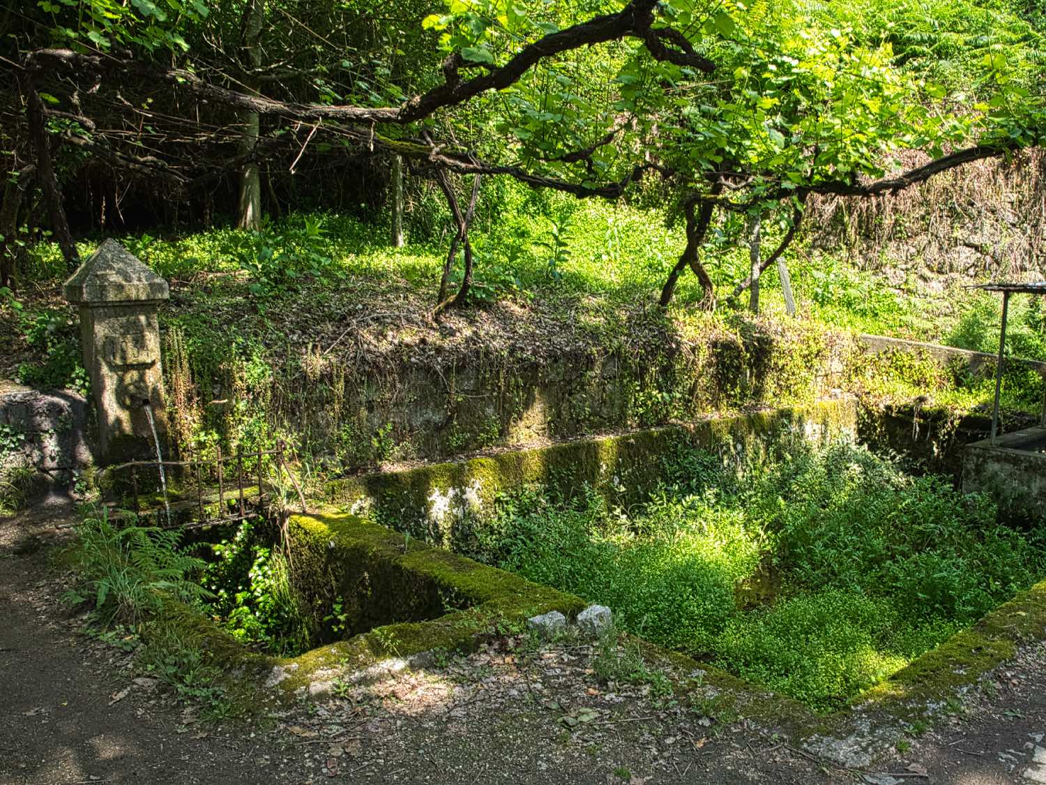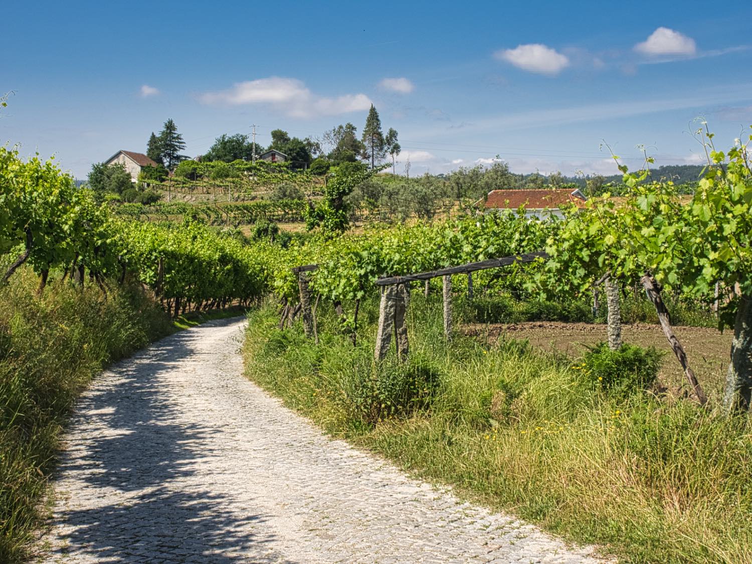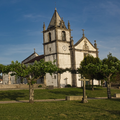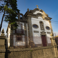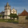 Nos espera un tramo urbano muy largo de más de dos kilómetros, hasta que la Travesa do Santo, que está empedrada nos va sacando poco a poco de nuevo al medio rural. Después de varios desvíos llegamos a un carretera asfaltada que se cruza con la Calçada da Piedade, justo en el punto en que encontramos un cruceiro. La calzada empedrada es medieval a pesar de que un cartel nos indica su origen romano. Subiremos por la calzada y enseguida llegamos al monasterio medieval de São Martinho de Caramos. El conjunto que forma la iglesia, junto al calvario y varias capillas y templetes constituyen un buen punto para reposar y coger fuerzas para afrontar los últimos kilómetros de la etapa que, de nuevo, serán por un entorno muy urbanizado.