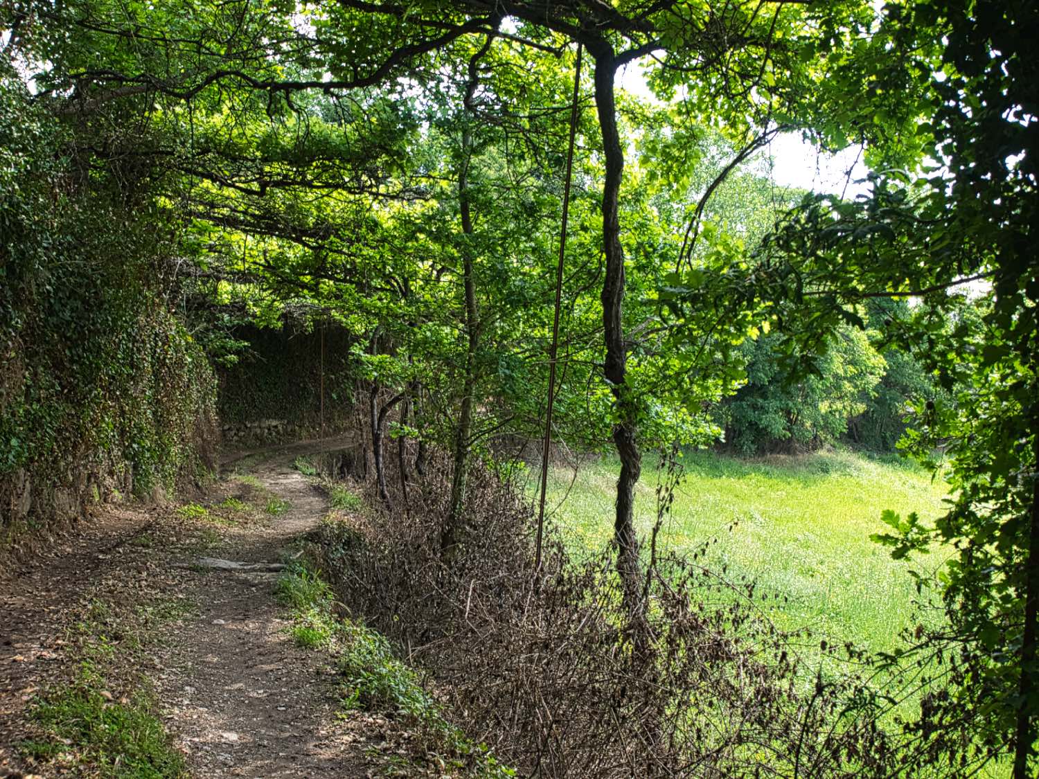 Confluimos con la Ecopista da Linha do Tâmega, de la que después de 400 metros nos desviamos a la izquierda por una calle empedrada, por la que seguimos ya por una zona más tranquila, en la que encontramos viviendas unifamiliares cada vez más dispersas, hasta que nos encontramos ya envueltos por el medio rural. Llegamos a una carretera asfaltada por la que seguimos 400 metros y luego cogemos un nuevo camino empedrado a la izquierda. Después de pasar por debajo de la N210 seguimos por asfalto un kilómetro y nos desviamos a la izquierda por un camino empedrado, que agradablemente nos lleva hasta Telões y su preciosa iglesia románica de Santo André.