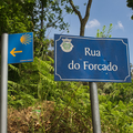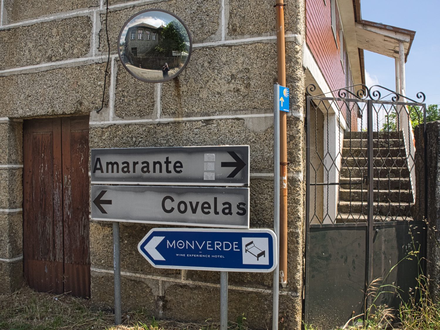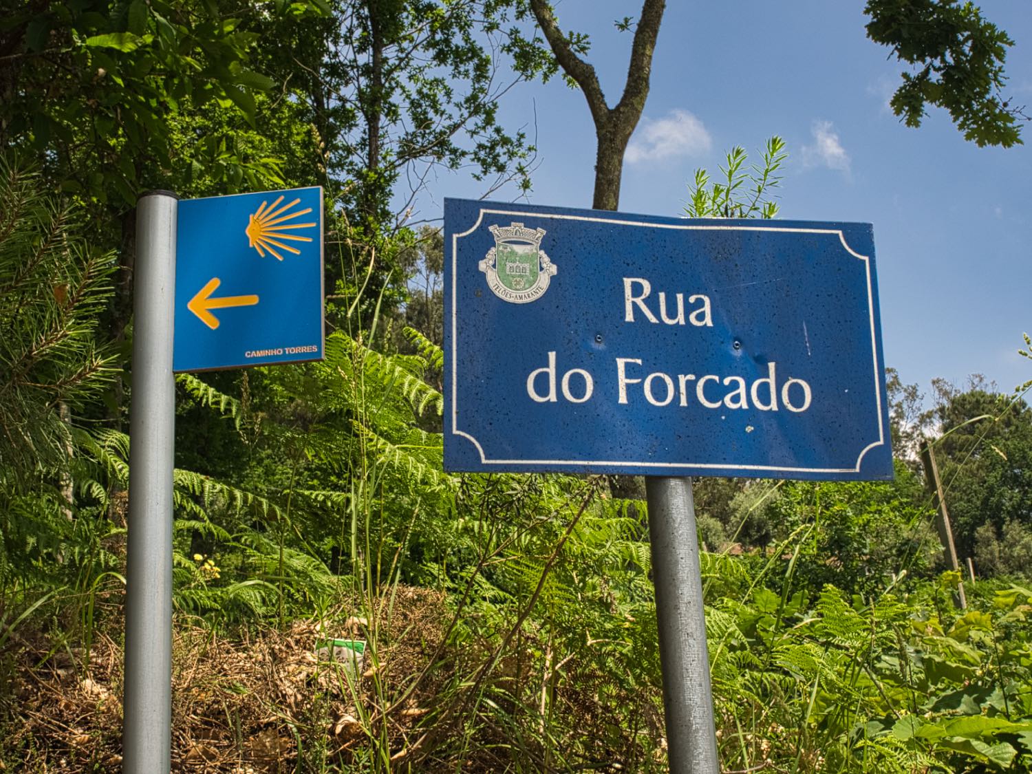 La Rua do Tapado nos saca de Telões hasta dar con un nuevo tramo de asfalto que seguimos 600 metros para tomar después a la izquierda la empedrada Rua do Forcado. Esta larga calle nos lleva entre chalés hasta un cruce con una pequeña rotonda. En la rotonda seguiremos la indicación hacia Covelas, para poco después girar a la izquierda. Este punto es la frontera entre los municipios de Amarante y Felgueiras, y esto se traduce en que la señalización vertical metálica finaliza y volvemos a encontrarnos con las estacas de señalización que nos habían indicado el camino a seguir hasta entrar en el municipio de Amarante.