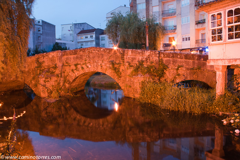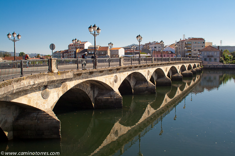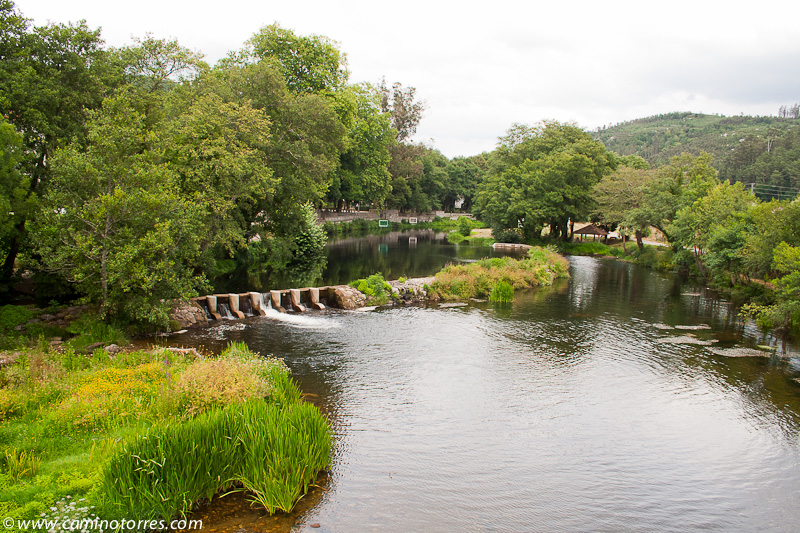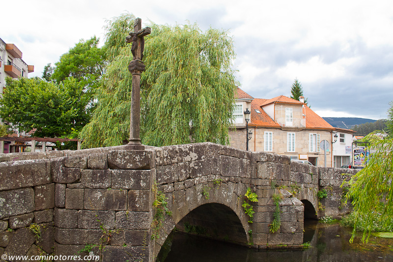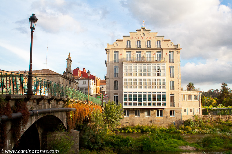 Finalmente, vamos a dar al puente sobre el río Umia, con unas bellas vistas del mismo, y punto obligado de paso de las vías de comunicación entre Pontevedra y Santiago de Compostela. Justo antes de cruzar el puente encontramos el Balneario Acuña, lugar emblemático de esta localidad famosa por su manantial de aguas termales.