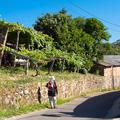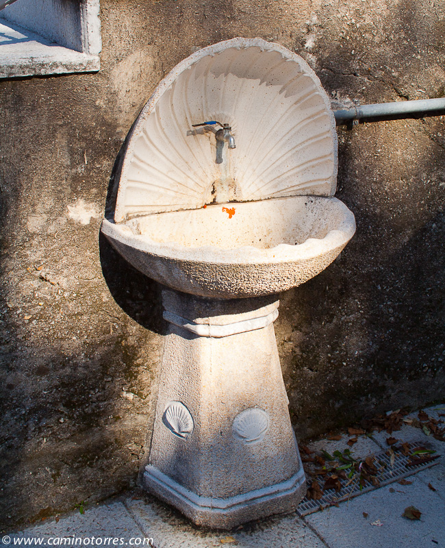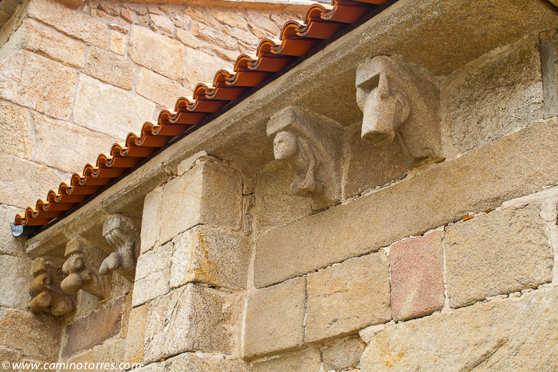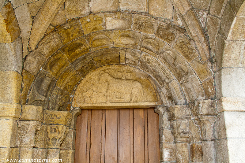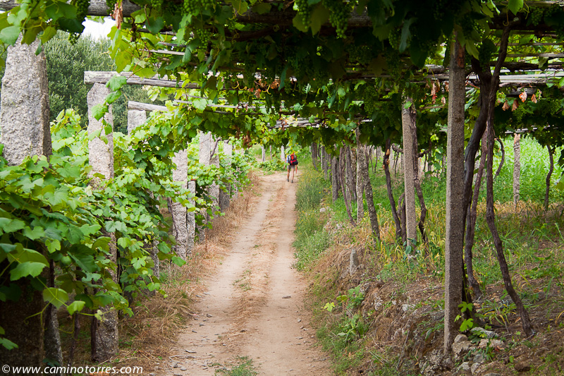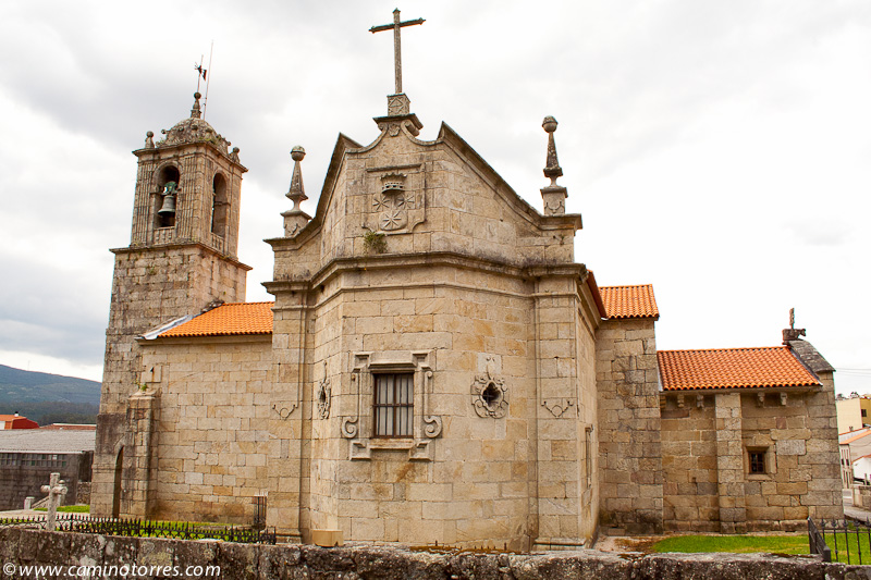 Poco después de Briallos, a la altura de la ermita de Santa Lucía, el camino gira a la izquierda y sigue en paralelo a poca distancia de la carretera nacional, por camino asfaltado entre viñas. Llegamos hasta Tivo con una fuente y un cruceiro notable, y poco después hasta la iglesia de Santa Mariña de Caldas, con restos románicos en su pórtico y modillones.